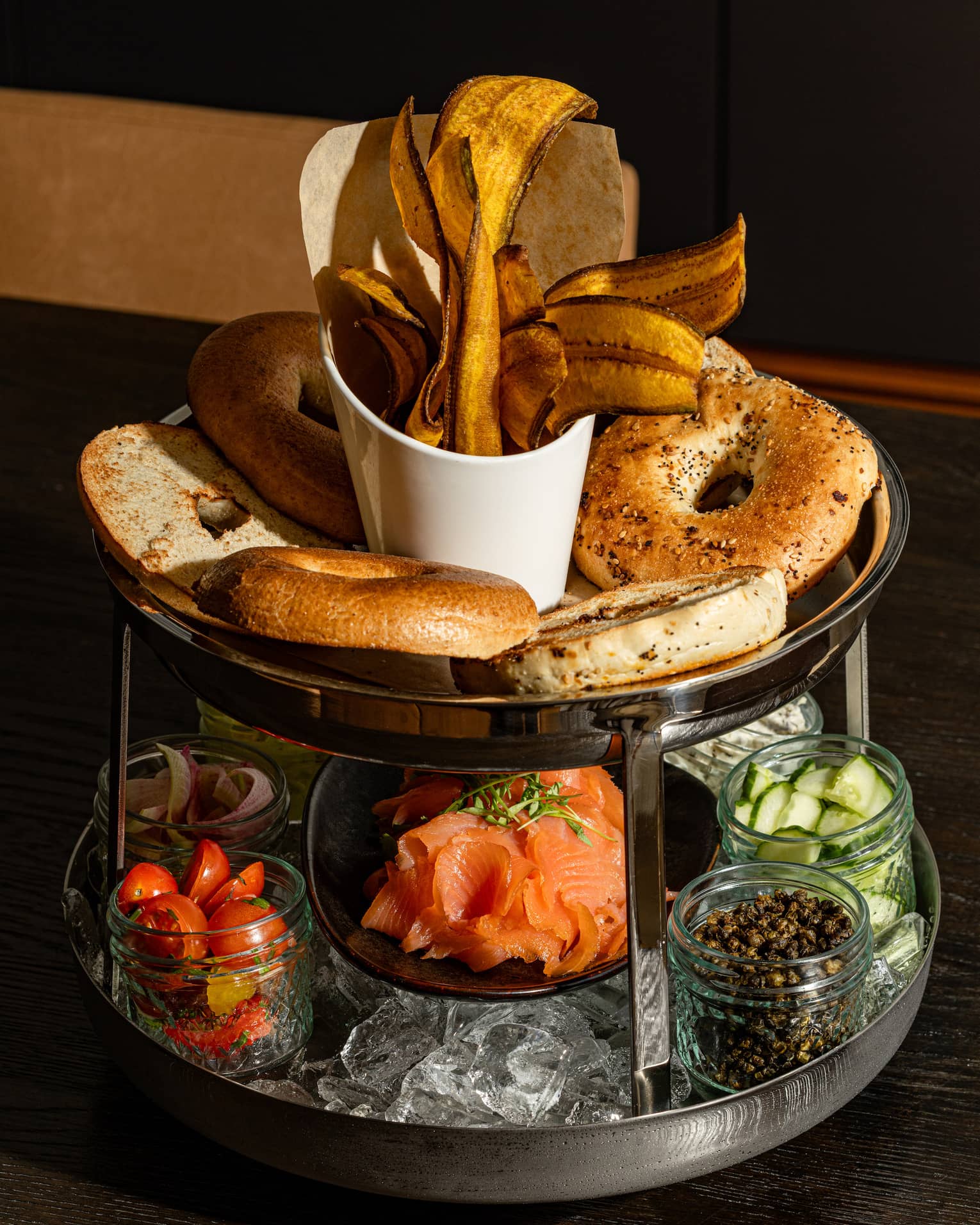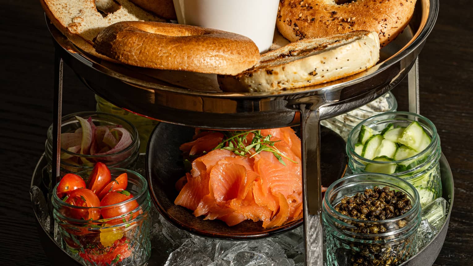 Smoked salmon tower served with freshly baked bagels and traditional accompaniments including capers, shaved red onion, tomato, cream cheese, and fresh herbs. A refined, shareable presentation designed for lingering mornings.