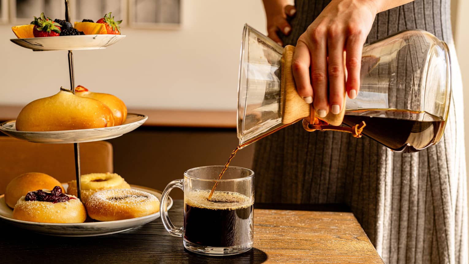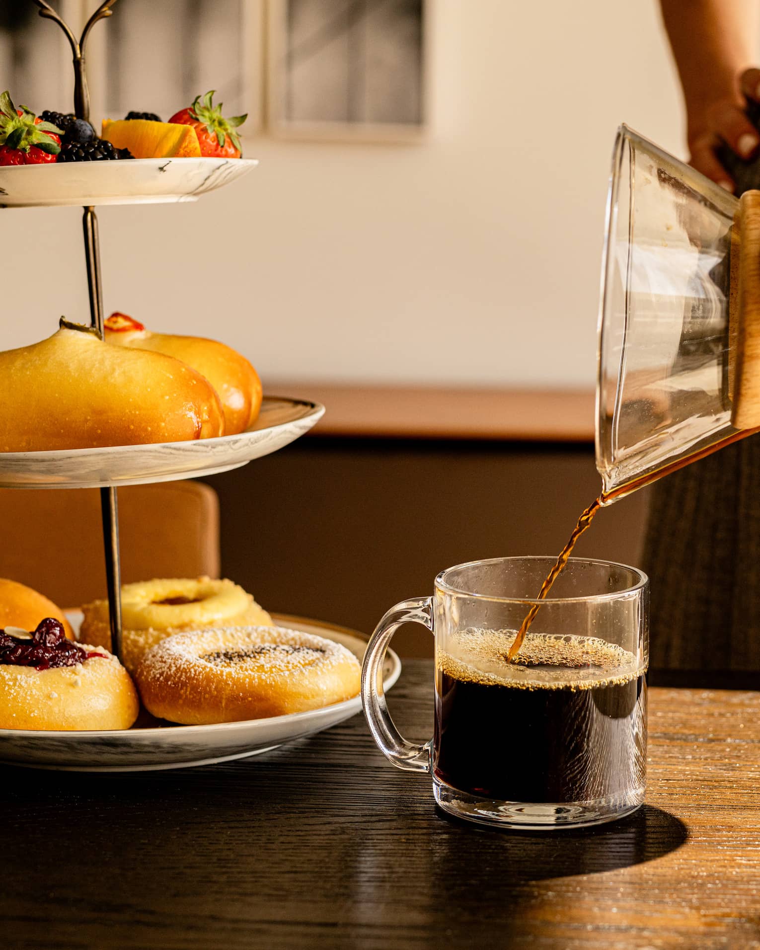 An in-room coffee and pastry experience celebrating local craft. A specialty pour-over from a Houston roaster is prepared fresh before you, paired with housemade kolaches, both savory and sweet.