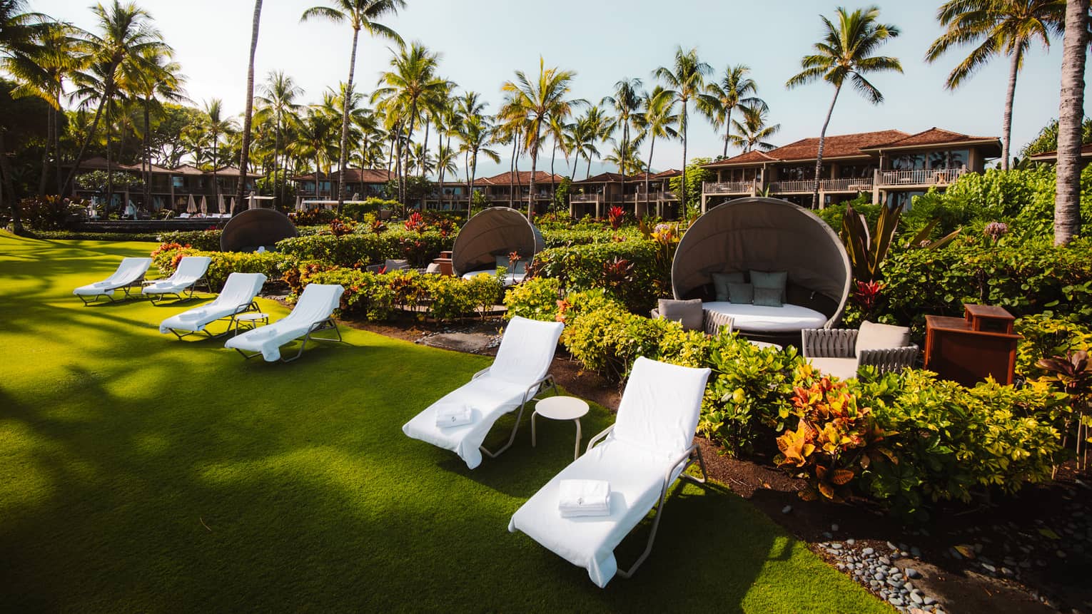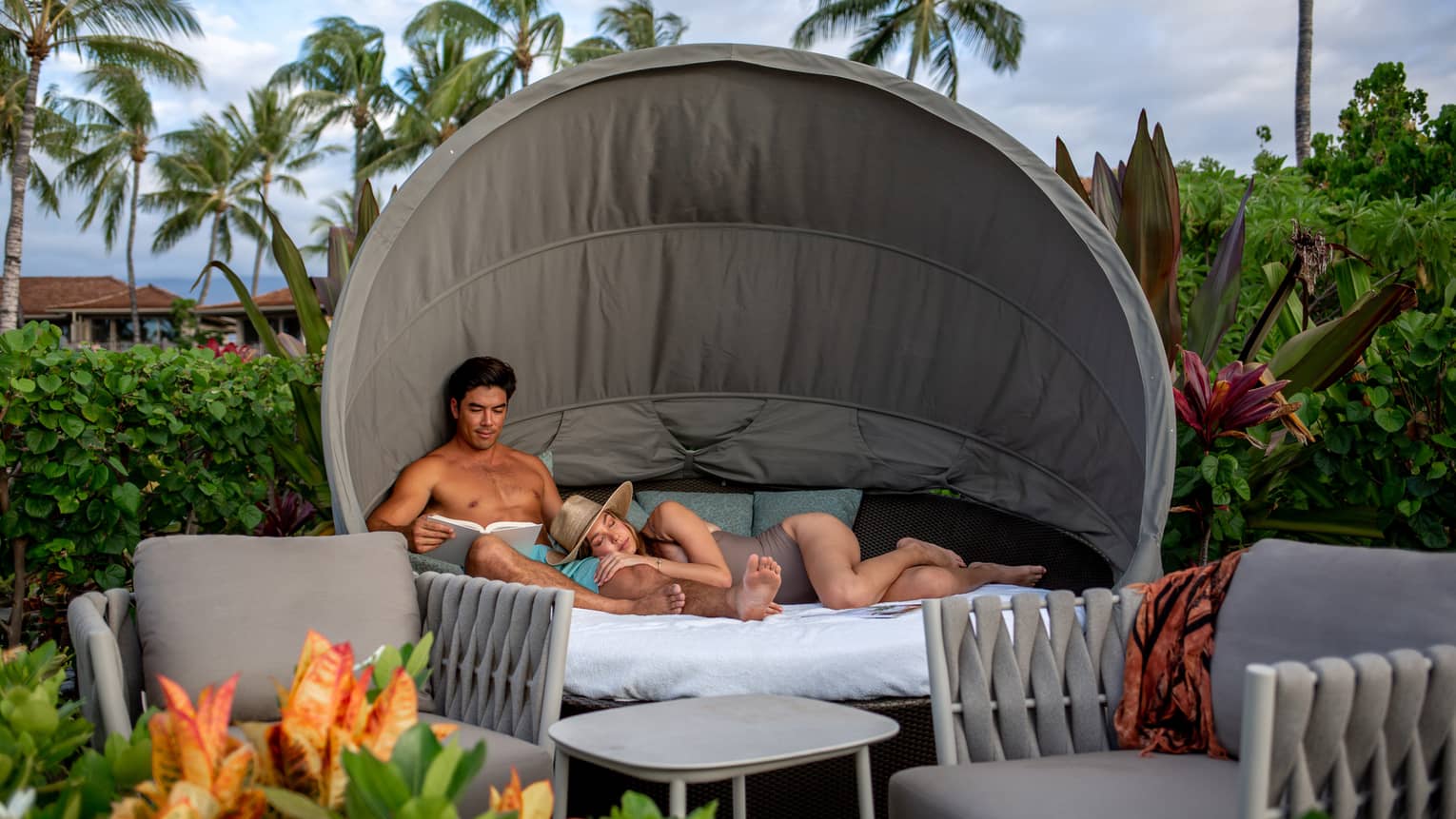 Rest and relax at one of our couples' nests at Palm Grove Pool. Dotting the landscape adjacent to the adults-only pool are three secluded nests, where you can enjoy stunning views and luxury amenities. Each private nest includes a customizable mattress and two adjacent lounge chairs.