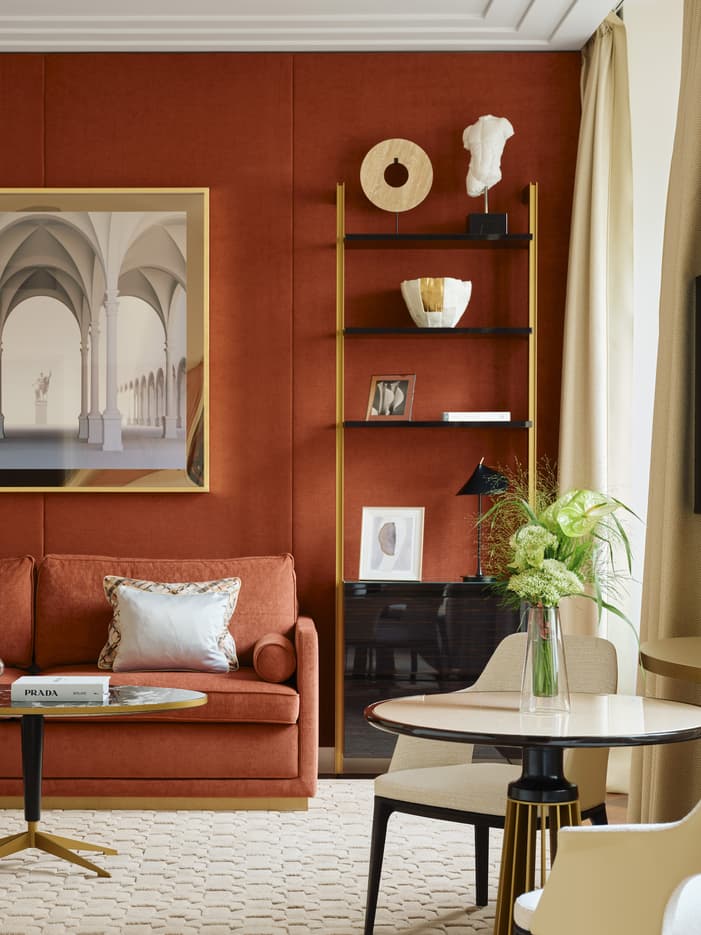 Circondatevi di tessuti Fortuny, esclusive finiture in legno e sontuosi marmi, in questa spaziosa camera ispirata al classico design milanese.
