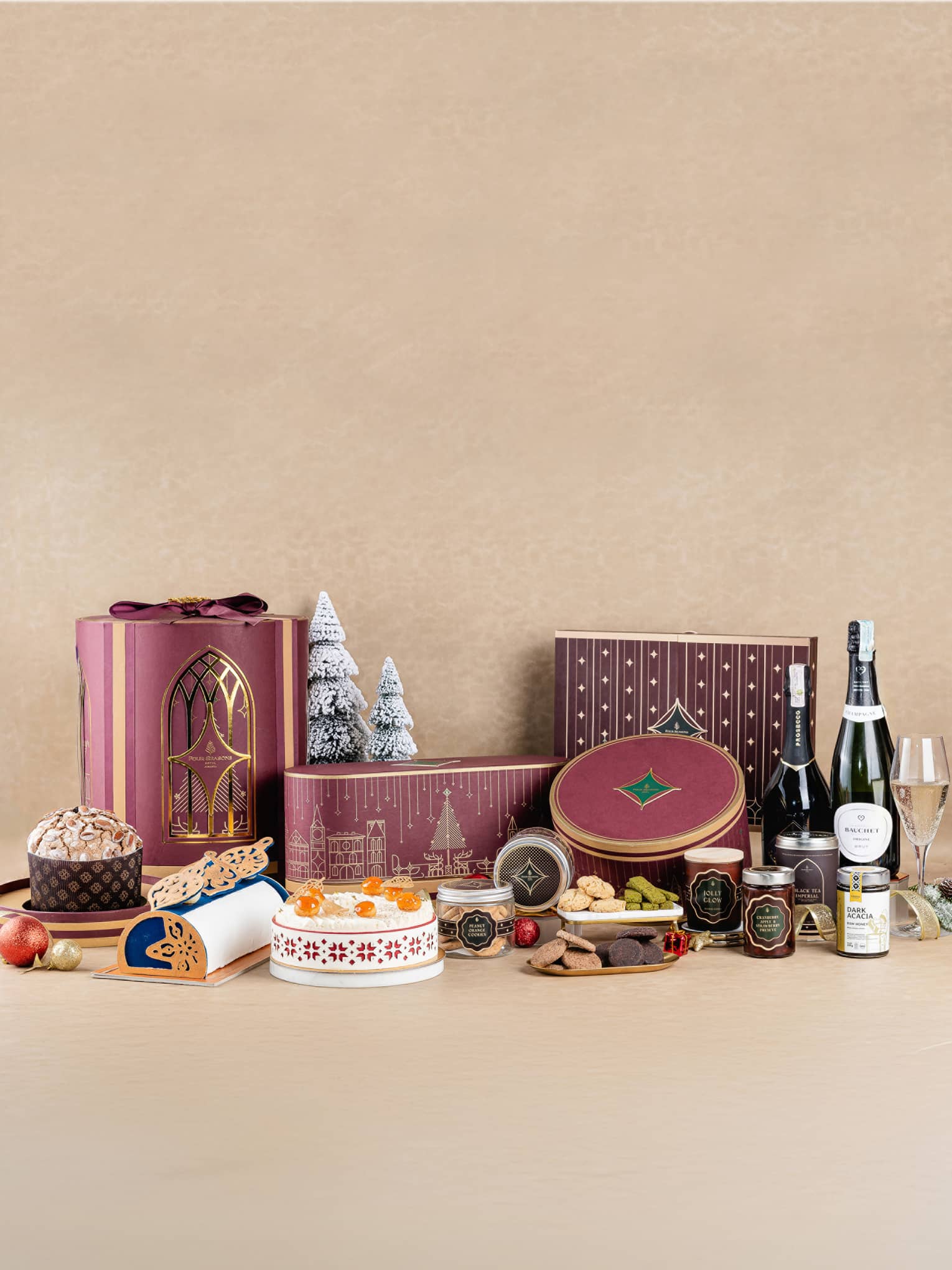 Our festive hampers bring Art Deco glamour to seasonal gifting traditions. Explore a wide selection of curated options – from a petite package of homemade cookies to our grandest hamper, complete with a bottle of wine.