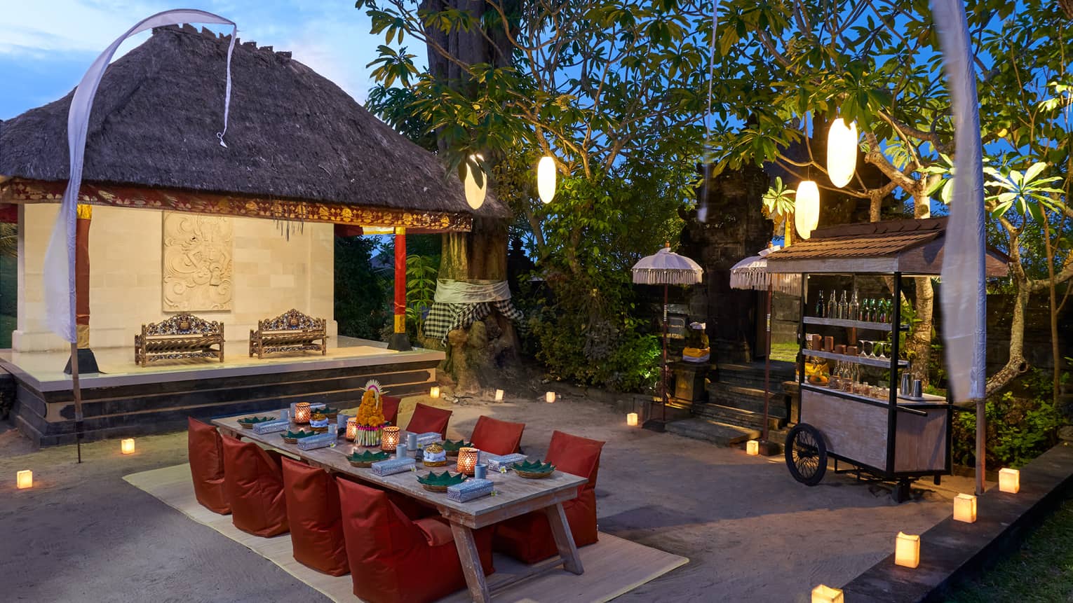 - Elevate your experience with a captivating dinner of authentic Balinese dishes, lovingly prepared using age-old recipes and served at our magical resort temple. Take a seat comfortably on the ground with a low table arrangement. This unique setup immerses you in the local culture, making for an unforgettable evening.