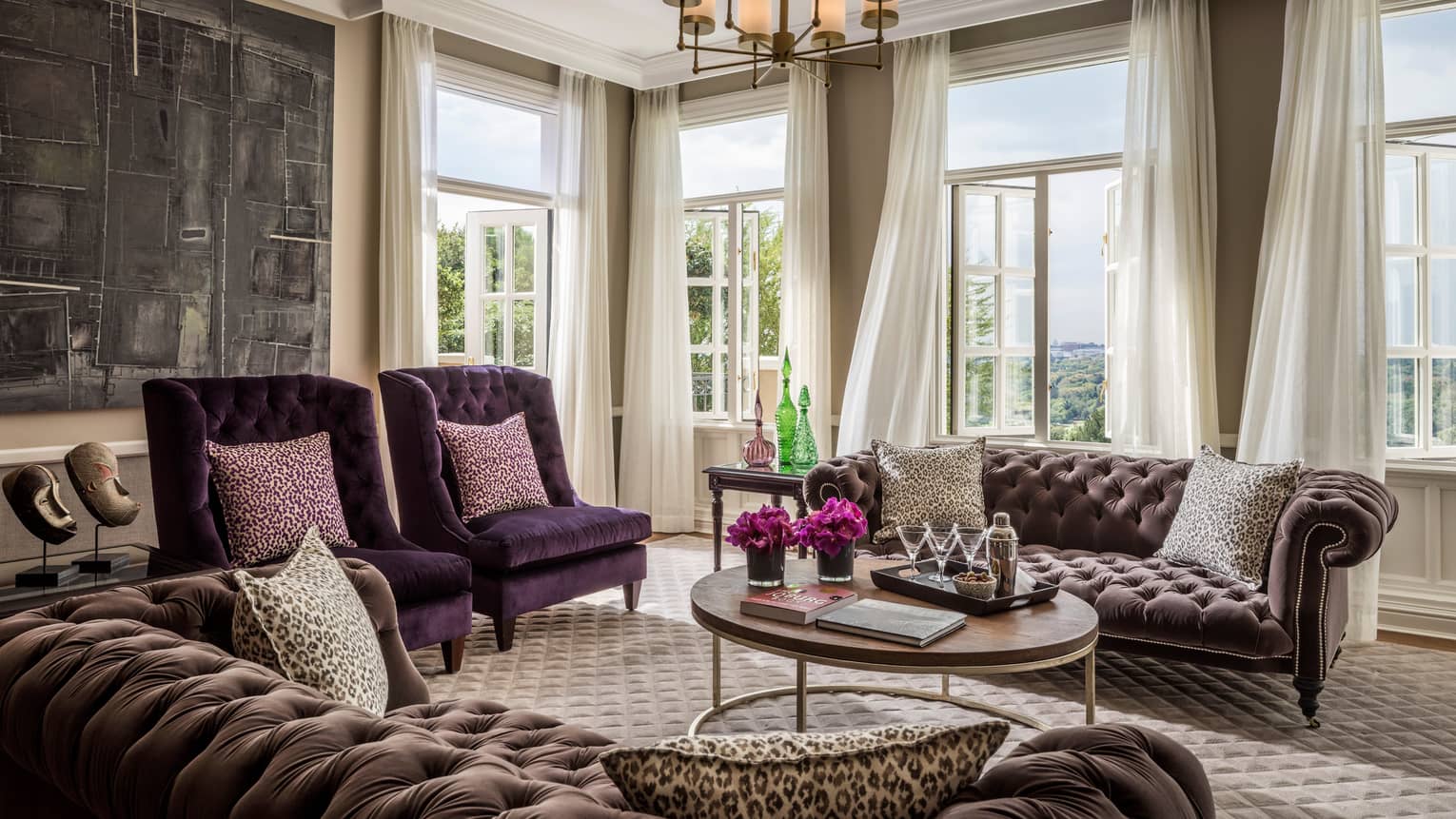 Tufted Chesterfield sofas and armchairs look chic and inviting in the Presidential Suite’s sunny sitting room
