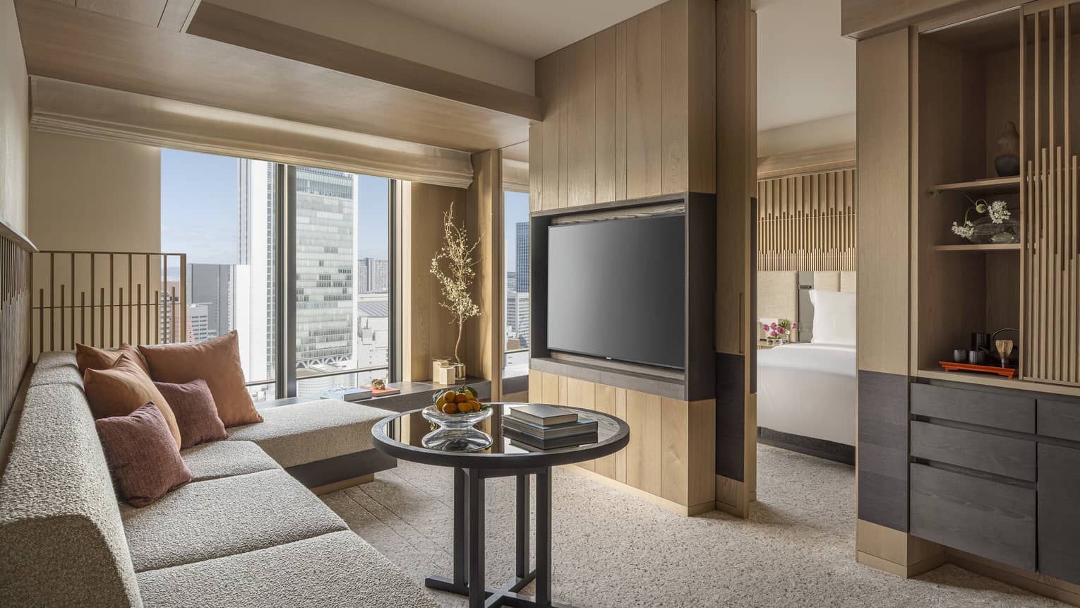 大阪のダイナミックな眺望を楽しめるグランド大阪スイートは、リビングルーム、ダイニングエリア、バーを備えた、ゆったりとくつろげるお部屋。ゲストのおもてなしにも十分な広さです。静かで落ち着いたベッドルームにはウォークインクローゼットとスパのようなバスルームが付き、ゆったりと過ごせます。