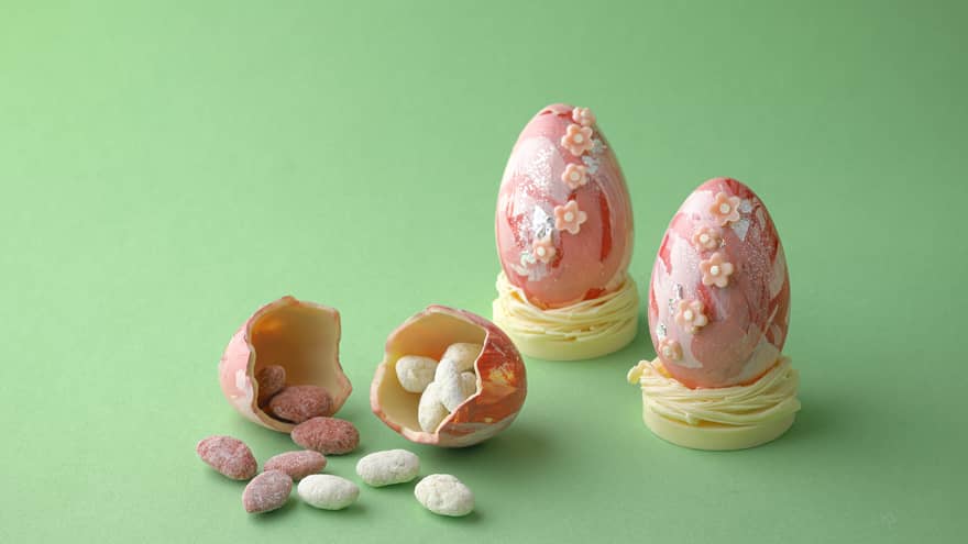 イースターエッグチョコレート4月のイースターに合わせ、イースターエッグチョコ レートをご用意いたしました。手描きで彩られた桜色 の卵型チョコレートの中には、柚子フレーバー、いちご フレーバーのアーモンドチョコレートが隠されています。||期間:2026年4月2日(木)~5日(日)||時間:13:00~19:00||料金:1,800円/個