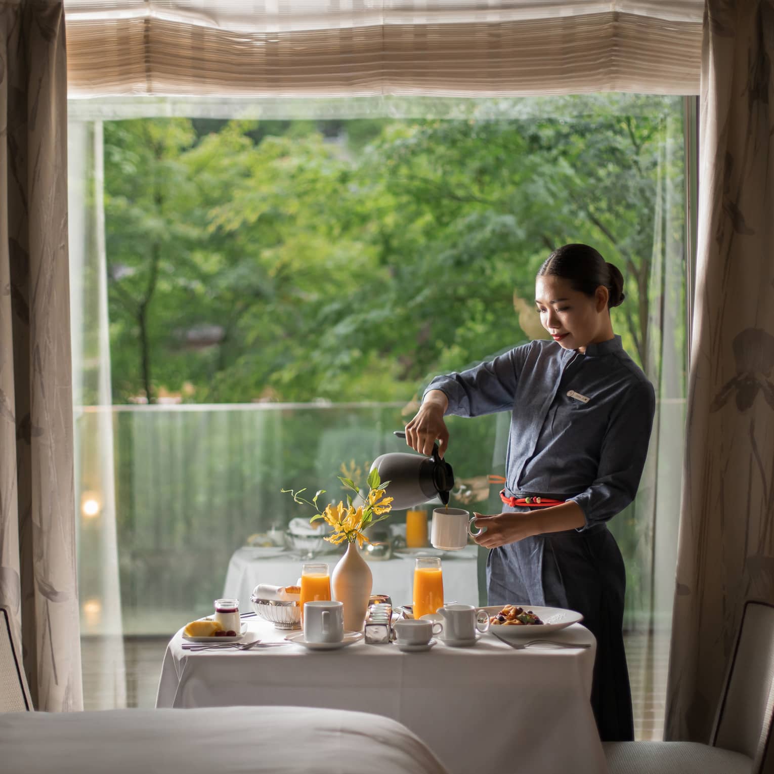 レストランの味を、時間やシーンに合わせて客室で愉しめるインルームダイニング。朝食からディナーまで、タブレットひとつで24時間ご利用いただけます。ご家族の団らんにも、プライベートなひとときにも寄り添う、心地よいお食事体験をお届けします。