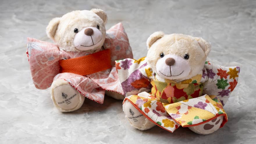 絵画のように多彩で華麗な友禅、丹後ちりめんや京絞りなどを使った手作りの着物に、ちりめんの帯を締めたフォーシーズンズオリジナルテディベア。右足にはホテルのロゴが刺繍されており、お土産や贈り物に最適です。