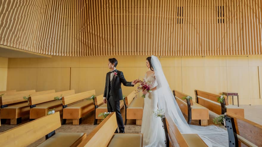 自然の温もりと光に包まれるロマンティックなチャペル。これからともに年輪を重ねていく、おふたりの大切な日を祝福するかのようにやさしい空気があたりを満たします。