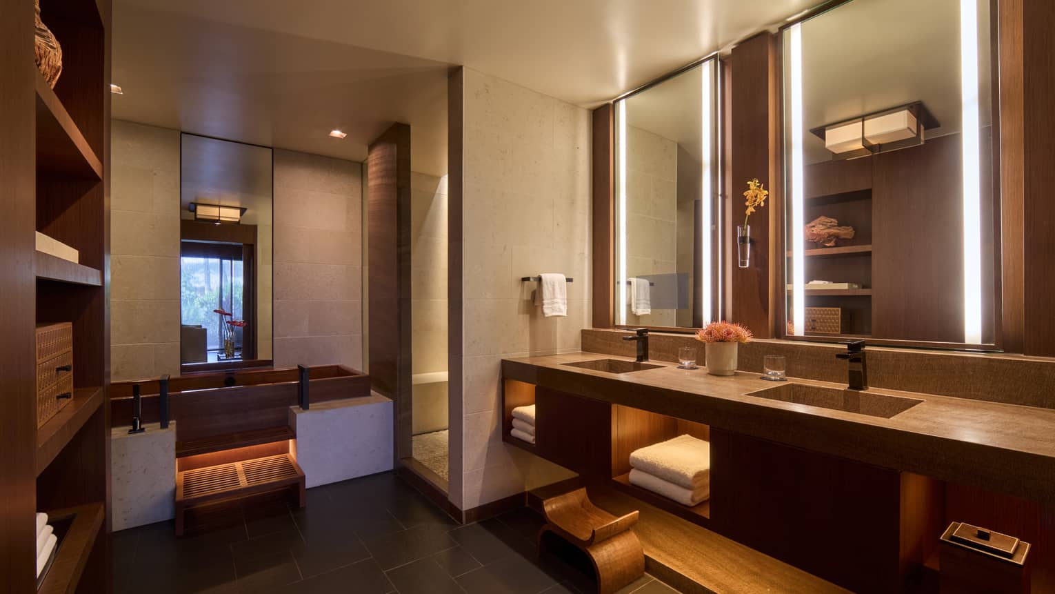 オリジナルの美術品とスタイリッシュなウッドインテリアが目を惹くオープンレイアウトのスイート。1階に位置し、趣のあるリビングルーム、6名用テーブル、オフィススペース、独立したマスターベッドルームが備わる広々とした贅沢な「隠れ家」で、自宅のように快適なひとときをお過ごしください。
