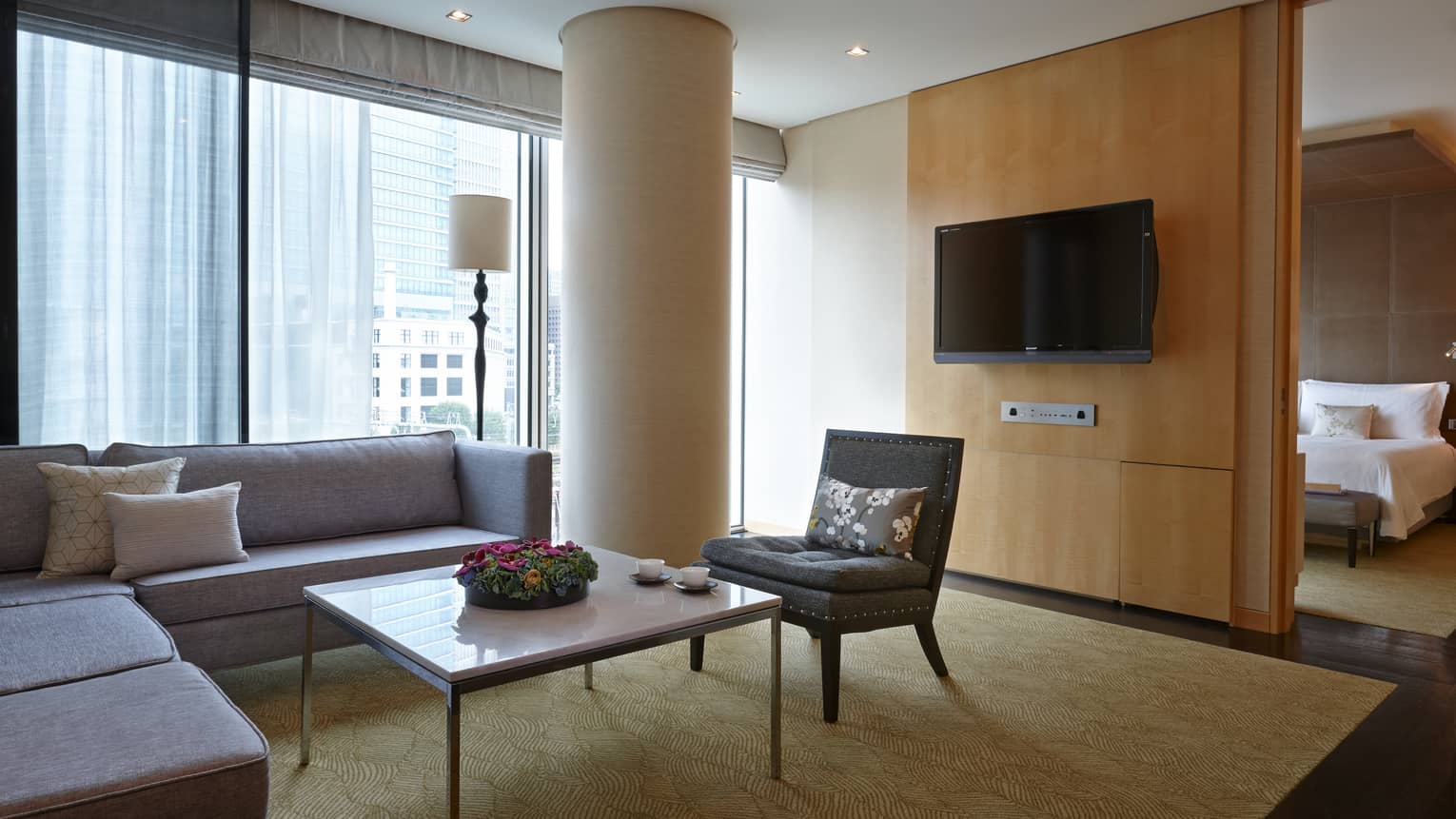 一方には緑豊かな皇居の杜、もう一方には高層ビル群を見渡す贅沢なコーナースイート。広々としたリビングルームで団欒のひとときに過ごした後は、静かなベッドルームでゆっくりとおやすみください。このスイートは2ベッドルームスイートとしてもご利用いただけます。詳細はホテルまでお問い合わせください。