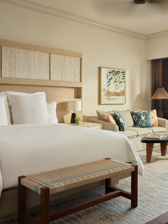 天井が高く、ハワイをモチーフにしたモダンな内装のお部屋です。太平洋と庭園を望むゆったりと落ち着いた雰囲気で、カップルでのご利用に最適です。