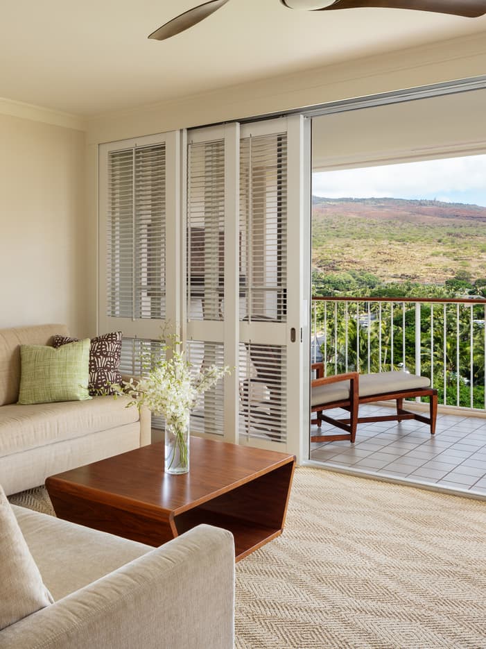 広々としたシックなお部屋です。ワイアナエ山脈の景色とスパのような大理石のバスルーム(独立したシャワー&バスタブ付)が、くつろぎのひとときをお約束します。
