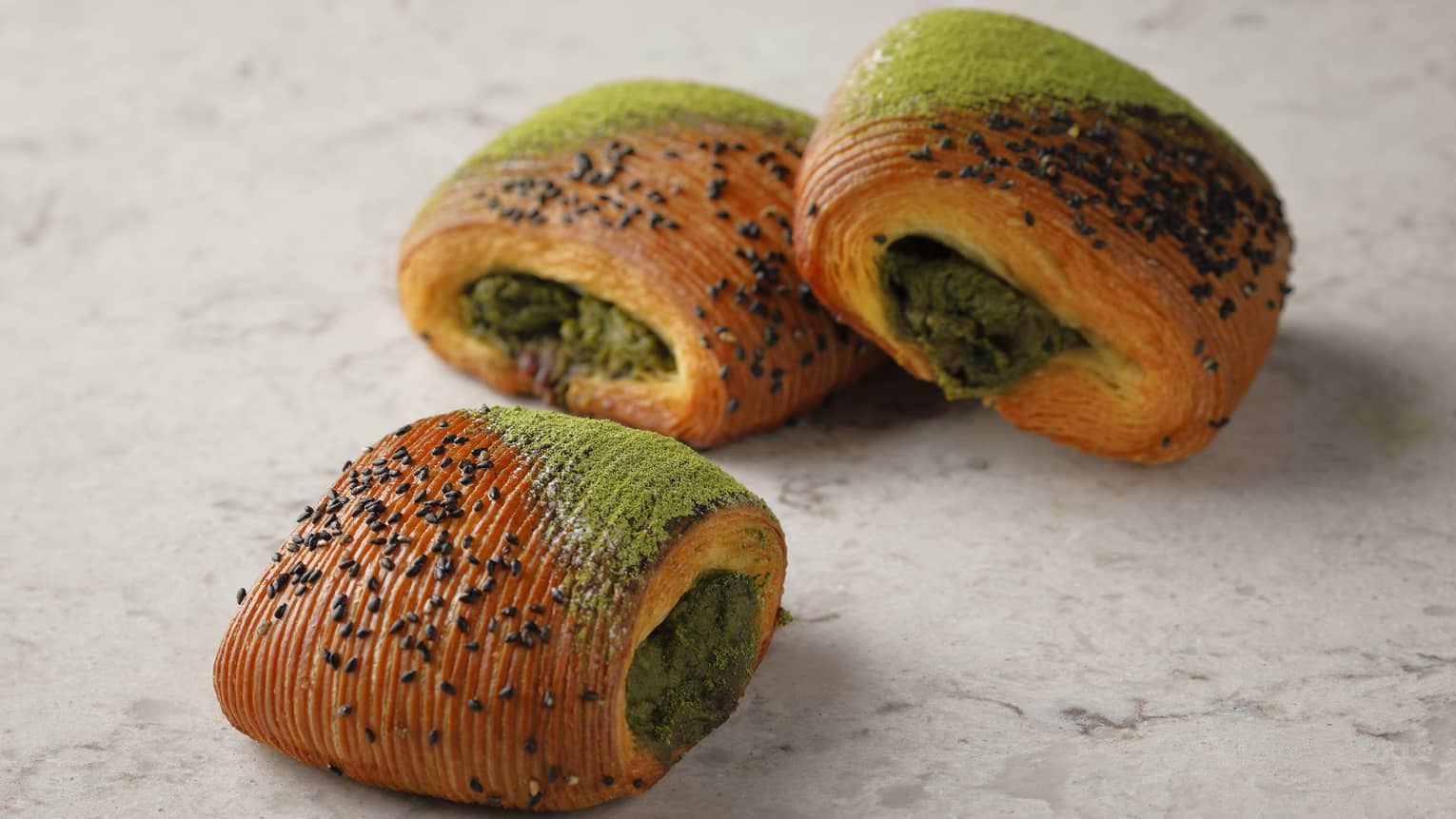 ほっと一息つきたいティータイムにぴったりの抹茶とあずきのパンスイス。しっとりと焼き上げた生地に濃厚でなめらかな抹茶クリームを重ね、あずきのやわらかな甘みがほどよく調和。抹茶のほろ苦さとあずきの優しい甘さが口の中で広がる、午後のひとときを贅沢に彩るひと皿としてお楽しみいただけます。||期間:2025年10月1日(水)~11月30日(日)||料金:750円