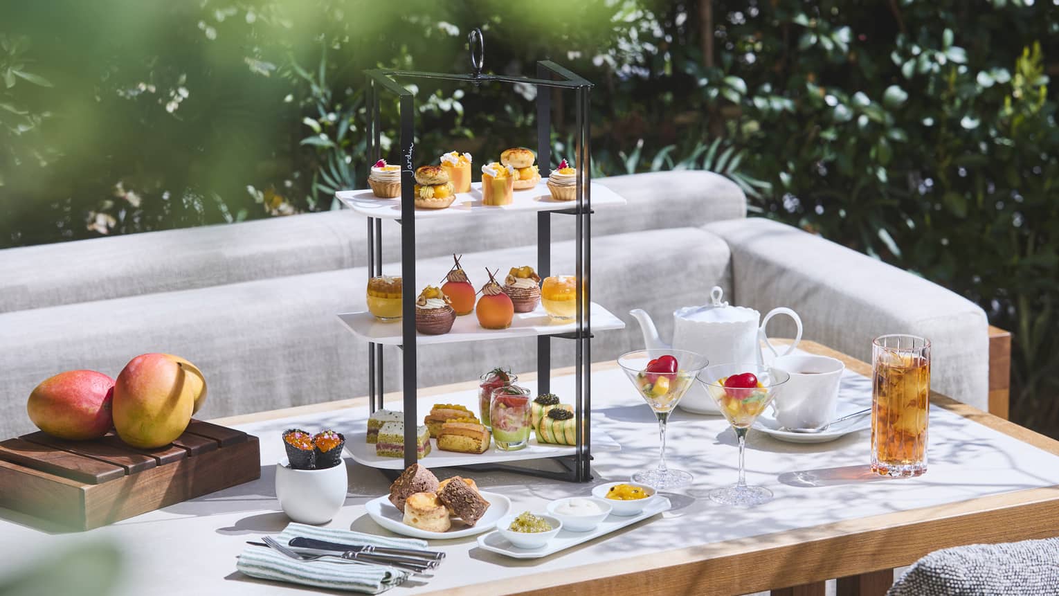 初夏に旬を迎えるマンゴーを贅沢に使用したアフタヌーンティーをご用意いたしました。マンゴーとパッションフルーツのタルトや、ジャスミンが香るヴェリーヌ、アールグレイを合わせたシブーストなど、瑞々しい甘みと爽やかな香りが広がるスイーツをお楽しみいただけます。さらに、ココナッツやトロピカルフルーツを取り入れたパフェが、初夏らしい彩りを添えます。セイボリーには、マンゴーをアクセントにしたクラブロールや、国産牛サーロイン、海老のサンドイッチなど、素材の味わいを活かした上品なセレクションをご用意。スコーンは、オレンジ&クリームチーズと、マカダミアナッツ&ココナッツチョコレートの2種を揃えました。紅茶やフレーバーティー、コーヒーをフリーフローでお楽しみいただきながら、初夏の余韻に浸る優雅なティータイムをお過ごしください。||期間:2026年5月1日(金)~6月30日(火)||時間:12:00~19:00(最終入店 17:00、2時間制)||料金:平日 8,800円 / 土・日・祝日 9,600円