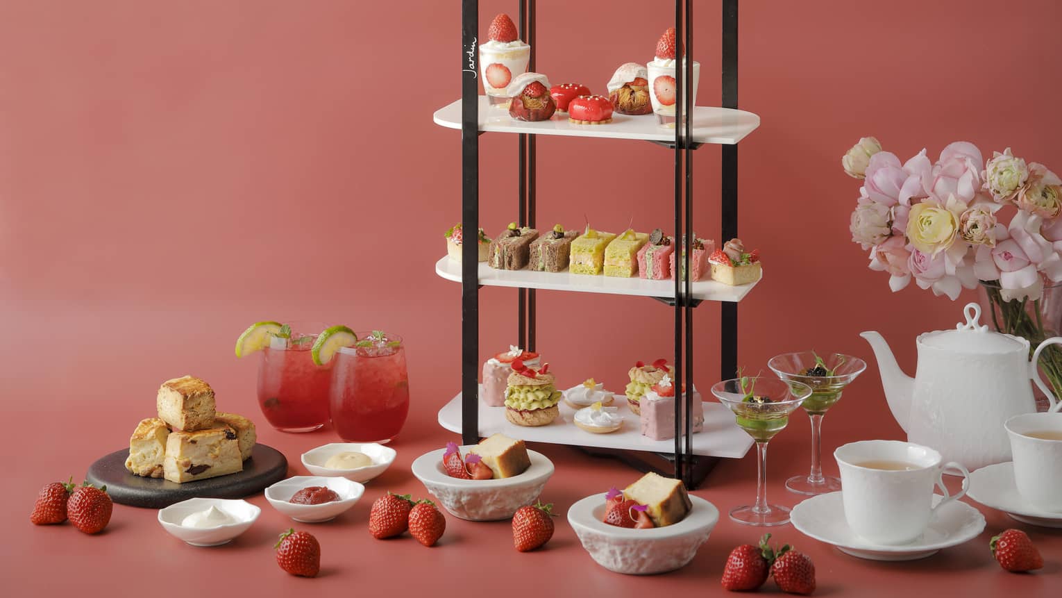 旬の国産苺を贅沢に使用したアフタヌーンティーをご用意いたしました。ふわふわのスポンジに軽やかなシャンティクリームを合わせたショートケーキをはじめ、ピスタチオや季節のフルーツを取り入れた彩り豊かなスイーツ、さらに冬ならではの味わいを楽しめる2種のスコーンをお楽しみいただけます。 セイボリーには、スモークダックと苺のタルトや、黒トリュフと丹波地鶏のサンドイッチなど、冬の味覚を上品に演出した品々を揃えました。 お飲み物は、紅茶や日本茶、フレーバーティー10種、コーヒー5種をフリーフローにてご用意しております。||期間:2026年1月5日(月)~4月2日(木)||時間:12:00~19:00(最終入店 17:00、2時間制)||料金:平日 8,800円 / 土・日・祝日 9,600円