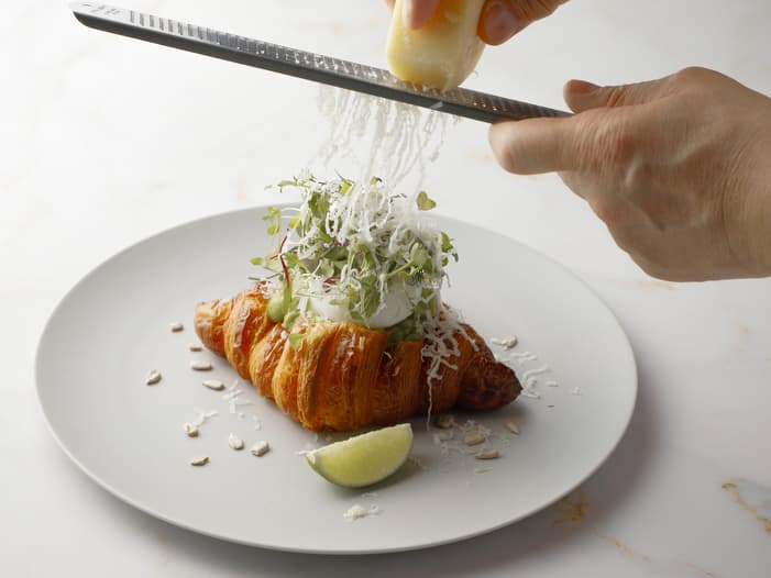 ファリーヌクロワッサンベネディクトポーチドエッグ、アボカド、季節のグリーンスプラウト