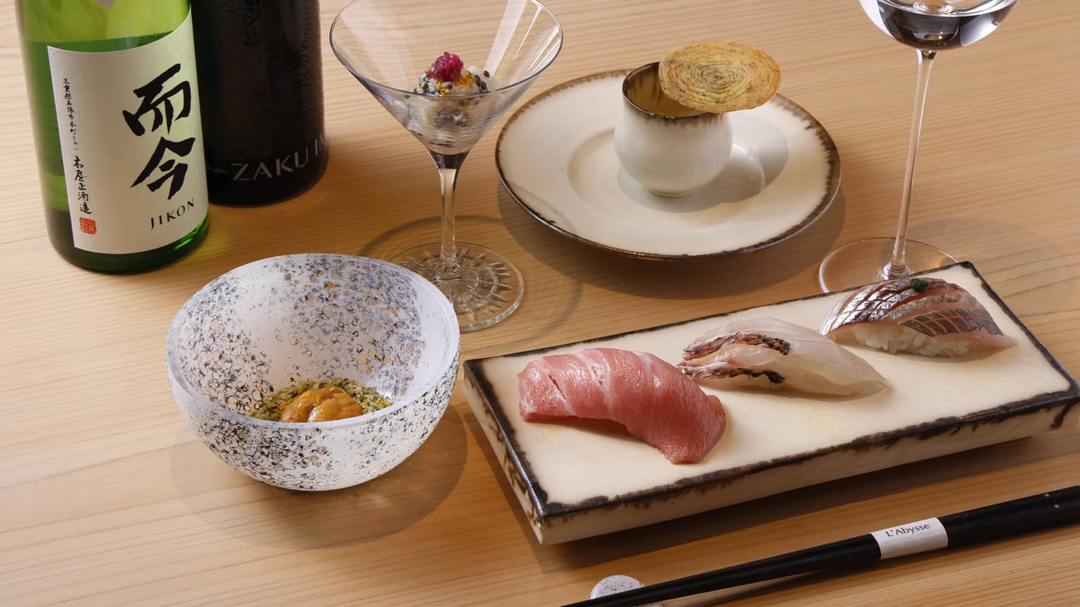 ランチ限定のにぎりおまかせショートコース。ヤニック・アレノ氏が手がける、季節の前菜からメインの江戸前鮨6貫に加え、シグネチャー料理の大地と海のコンソメ・スープ、華やかなデザートまで、和とフレンチが美しく調和した贅沢なコースを1時間以内でお楽しみいただけます。ご接待やお忙しいビジネスシーンにも最適です。|| 期間:2025年8月18日(月)~||料金:お一人様9,000円