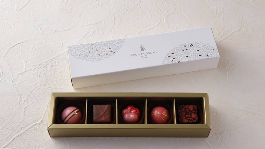 ファリーヌ:バレンタインチョコレート5種類のフレーバーチョコレートを詰め合わせました。香ばしいローストティー×キャラメル、パッションフルーツ×国産紅茶、ひと足早く春を感じる桜×ミックスベリー、やさしく心を和ませるゆず×カモミール、そしてアクセントの効いた黒七味まで、ひと粒ごとに個性豊かな味わいをお楽しみいただけます。大切な方へのギフトにはもちろん、自分へのご褒美にもおすすめです。||期間:2026年1月26日(月)~2月14日(土)||料金:5ピース 4,500円