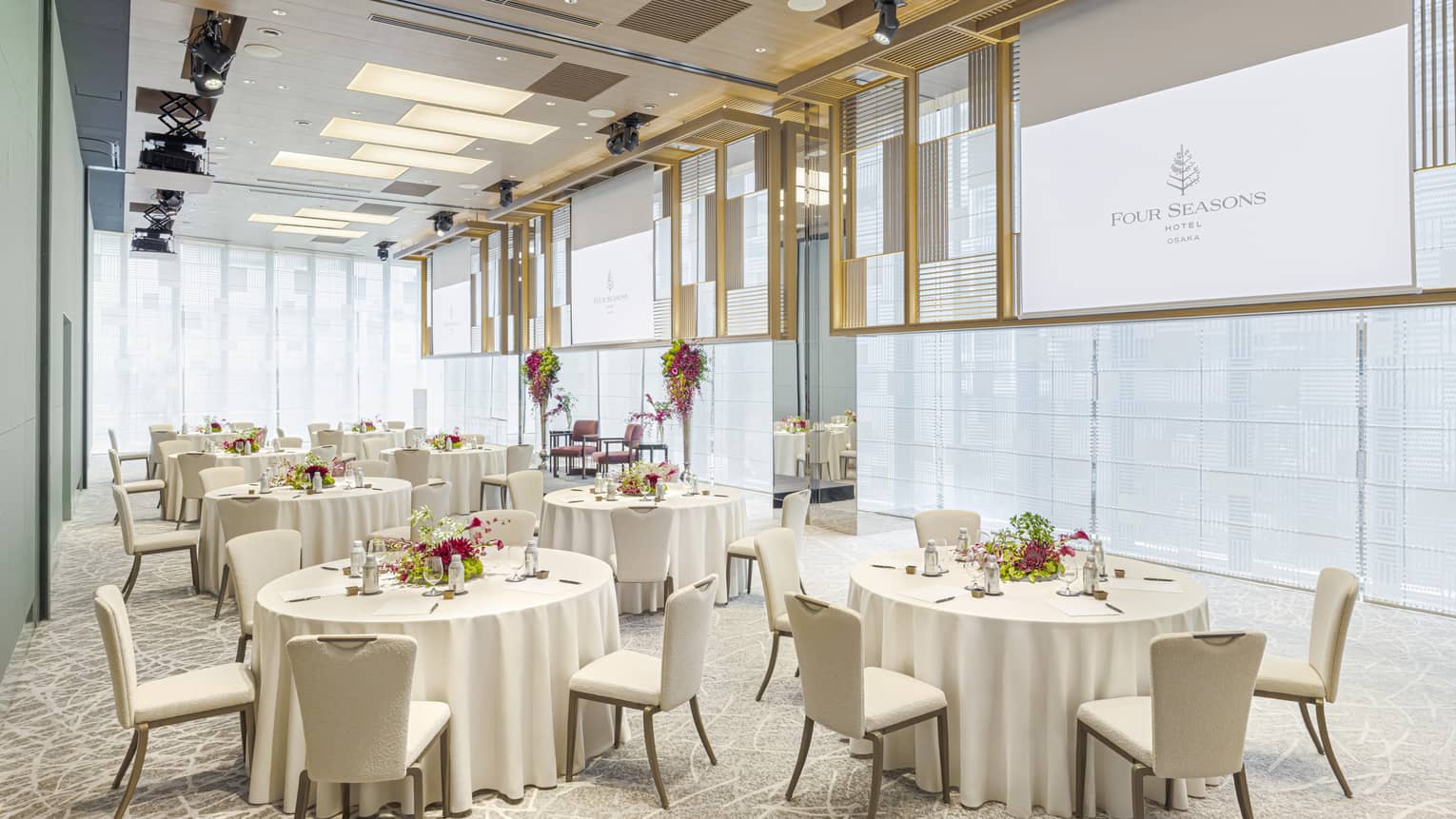 大阪の主要ターミナルである大阪駅(梅田駅)や人気のナイトスポット北新地が徒歩圏内のフォーシーズンズホテル大阪では、パーティ会場や宴会場、会議場、展示会、レセプションなどにご利用いただけるイベント会場をご用意しております。2階のボールルームは、人数や利用目的によって、3つの会場に仕切ることができます。また、ゆったりとしたホワイエやガーデンテラス(屋外)もあり、ワンフロアを貸し切ってのご利用も承ります。また、37階にあるスカイサロンは、開放感ある高い天井、またスタイリッシュなインテリアを備え、会議や宴会にご利用いただくのに最適です。