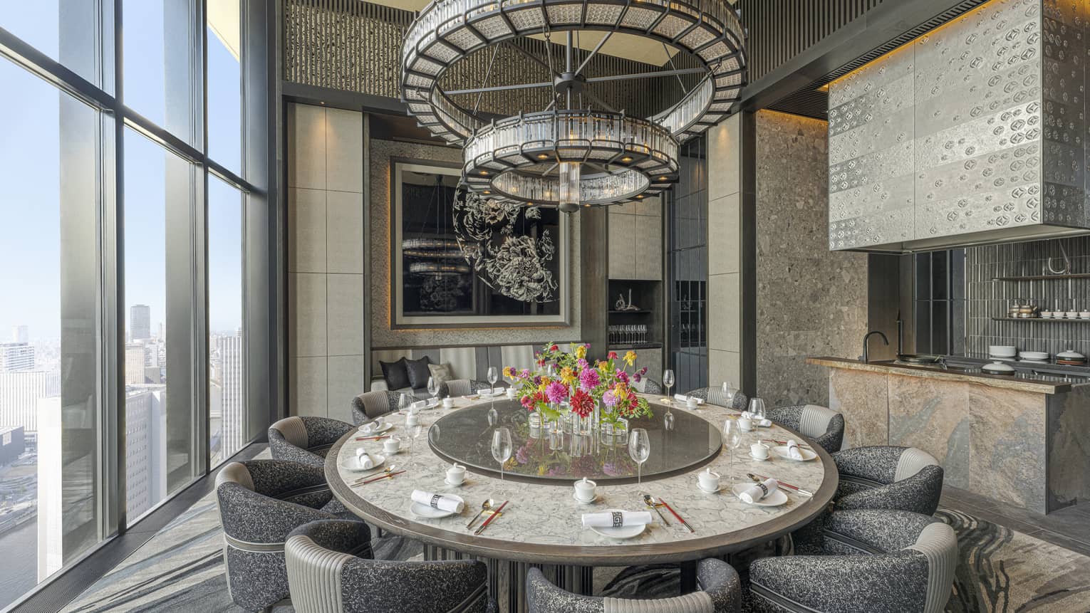 個室∸江南春 (ジャンナンチュン)ビジネスミーティングやご友人・ご家族とのお集まり、お祝いの席に最適な個室をご用意しております。リバーサイドと中之島の美しい景色を眺めながら、開放感あふれるオープンキッチンから提供される料理の数々をお愉しみいただけます。2名様から最大12名様までのご利用が可能です。