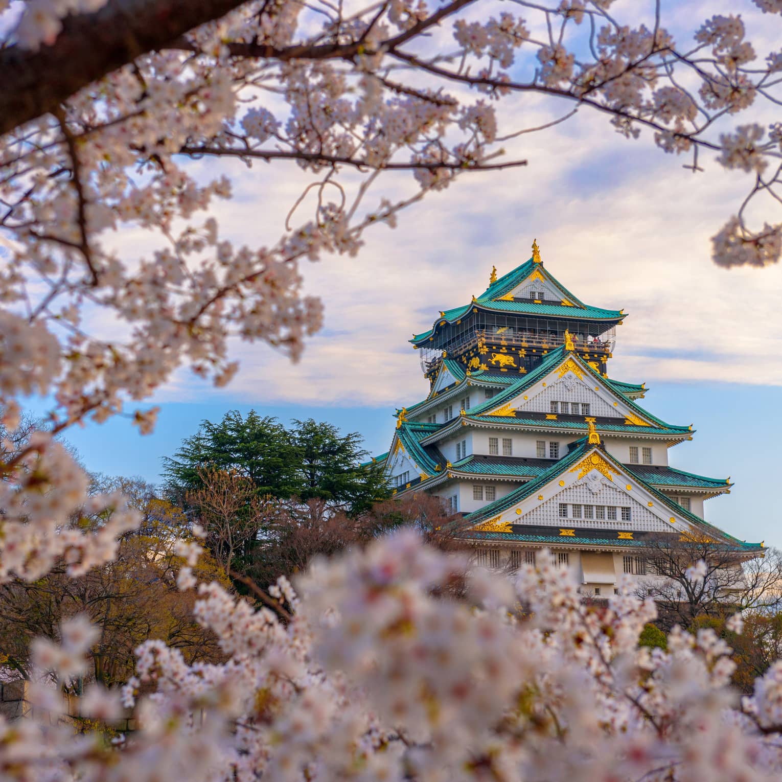大阪城公園は、桜の美しさを楽しむための最も象徴的なスポットのひとつです。桜の季節になると、4,000本以上の桜が一斉に咲き誇り、公園全体が美しいピンクと白の花々で彩られます。広大な公園内を散策したり、桜の木の下でピクニックを楽しんだり、大阪城と桜の絶景を堪能したりすることができます。
