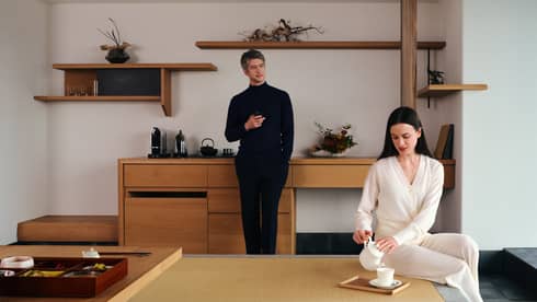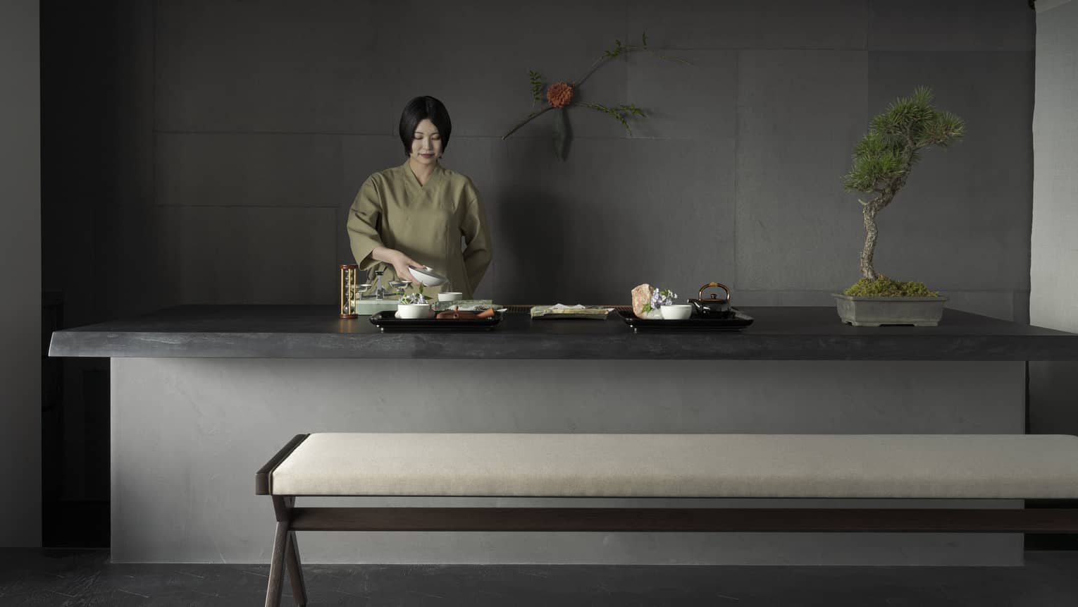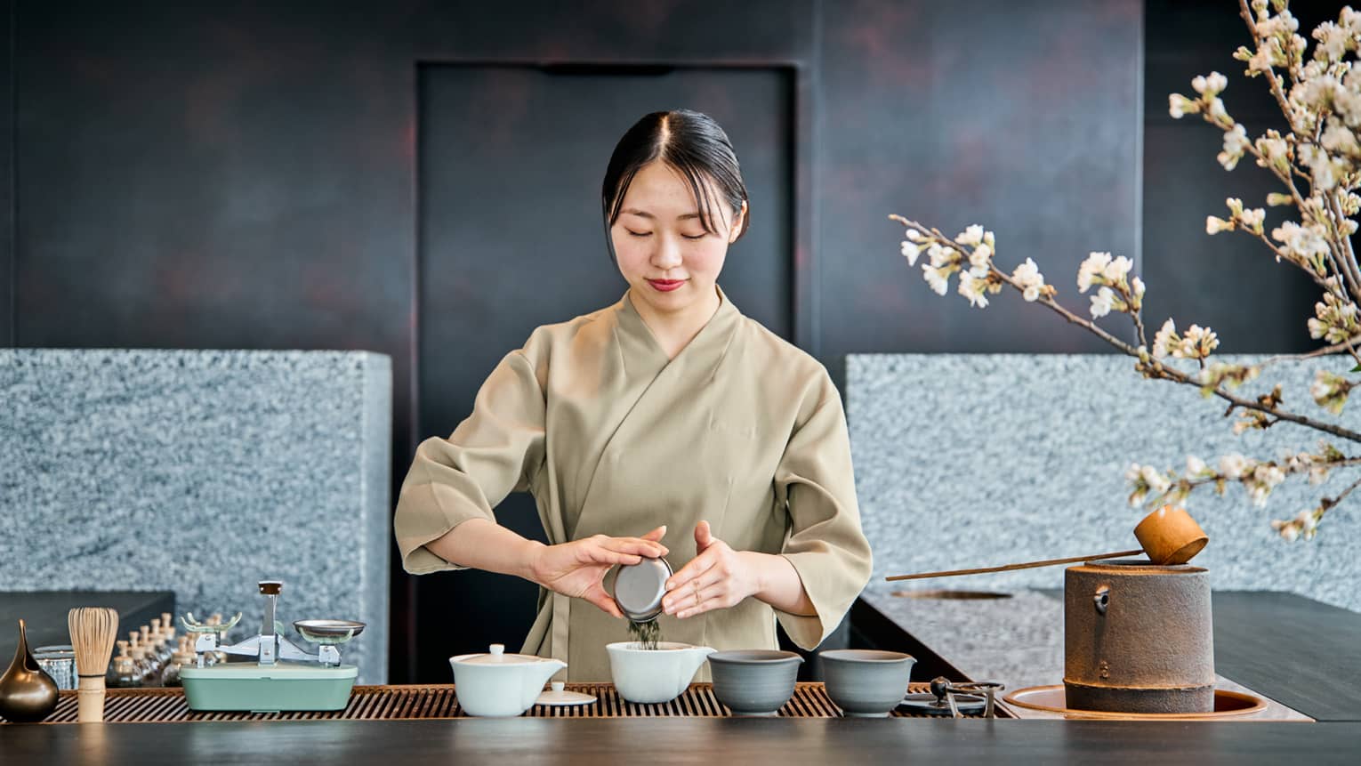 伝統的な浴衣は「GENSUI(玄水)」の各客室にご用意しております。柔らかな肌触りの浴衣に身を包み、ゆったりとおくつろぎいただけます。また、そのまま客室の浴衣でティーラウンジ「SABO」へお越しいただければ、日本茶を楽しみながらリラックスできる、本格的な和の時間をお過ごしいただけます。