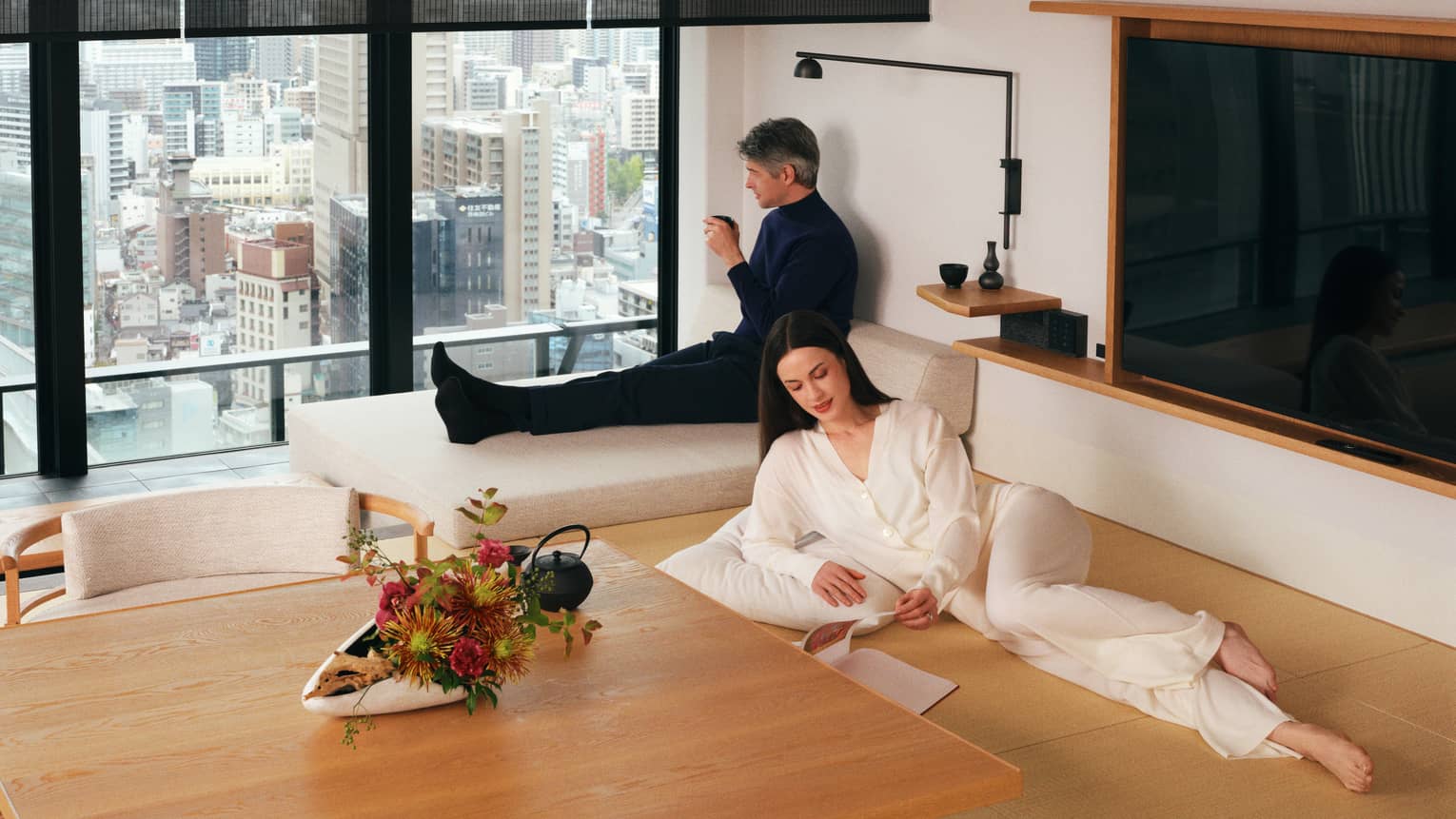 モダン旅館をコンセプトにした畳敷きの特別コンセプトフロア「GENSUI(玄水)」では、靴を脱いで畳に上がり、ゆったりとお寛ぎいただけます。天井から床までの大きな窓には大阪の街並みを一望できる眺望、フォーシーズンズオリジナルの布団仕様の贅沢で柔らかなマットレスで、現代の生活様式に合わせた新たな旅館体験をご提案いたします。