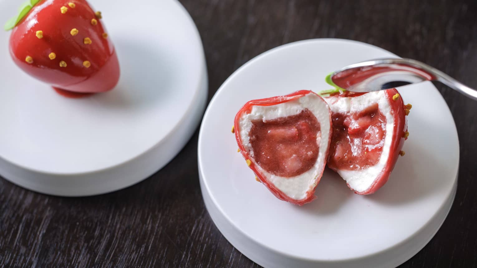 苺ジュレ ヨーグルトムース旬の苺が放つ、清らかな酸味と優雅な香りを引き立てるために誕生した、至高のスイーツ。なめらかなヨーグルトムースの上品なコクに、果実の旨みを閉じ込めた苺のジュレが華やかに重なります。 異なる酸味と甘みが精妙に調和し、ひと口ごとに奥行きのある芳醇な味わいが広がります。その余韻すら計算し尽くしたおいしさの芸術、苺の美しさを極めた一皿をご賞味ください。