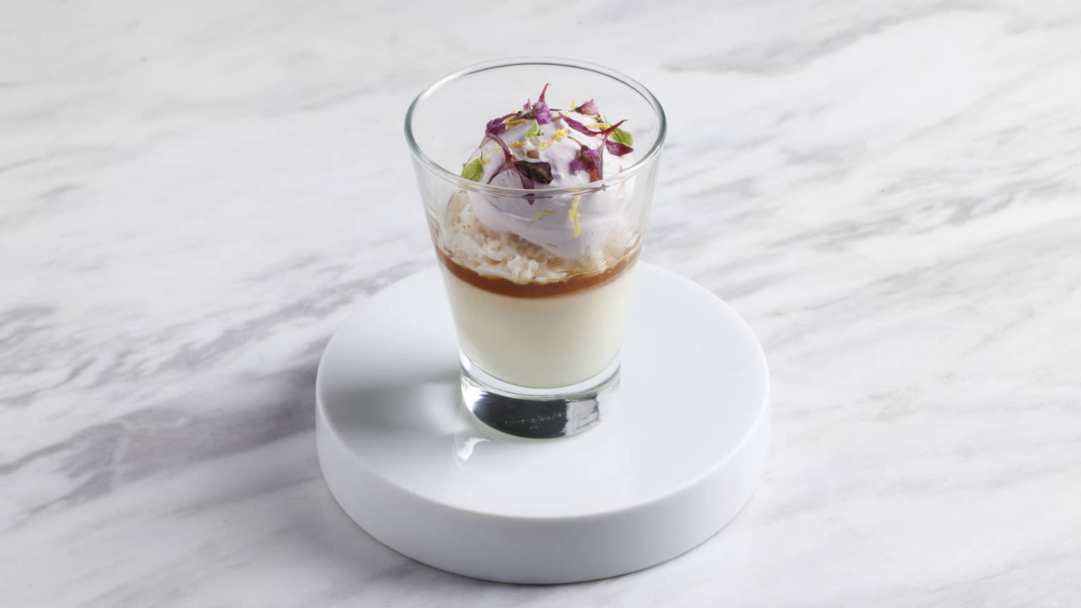 白菜のブランマンジェとラズベリークリームのべリーヌ ズワイガニと柚子のタルタル 穂紫蘇アフタヌーンティーのお皿の上で、まるでスイーツのように可憐で繊細なグラスアミューズ。 冬の味覚、ズワイガニの甘みを柚子の爽やかな香りで引き立て、 滑らかな白菜のブランマンジェとラズベリーの酸味が 季節の余韻を繊細に奏でる、冬のメニューを代表する一品です。