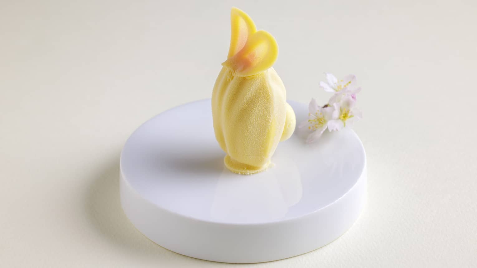 カモミールムース、金柑とブラッドオレンジのコンフィチュール金柑とオレンジの繊細な酸味に、カモミールのやさしい花の香りが重なり合い、爽やかな余韻。ヘーゼルナッツの芳醇で香ばしい風味をアクセントに、愛らしい姿の中に秘められた三位一体のハーモニーに、思わず笑みを誘う驚きを届けます。