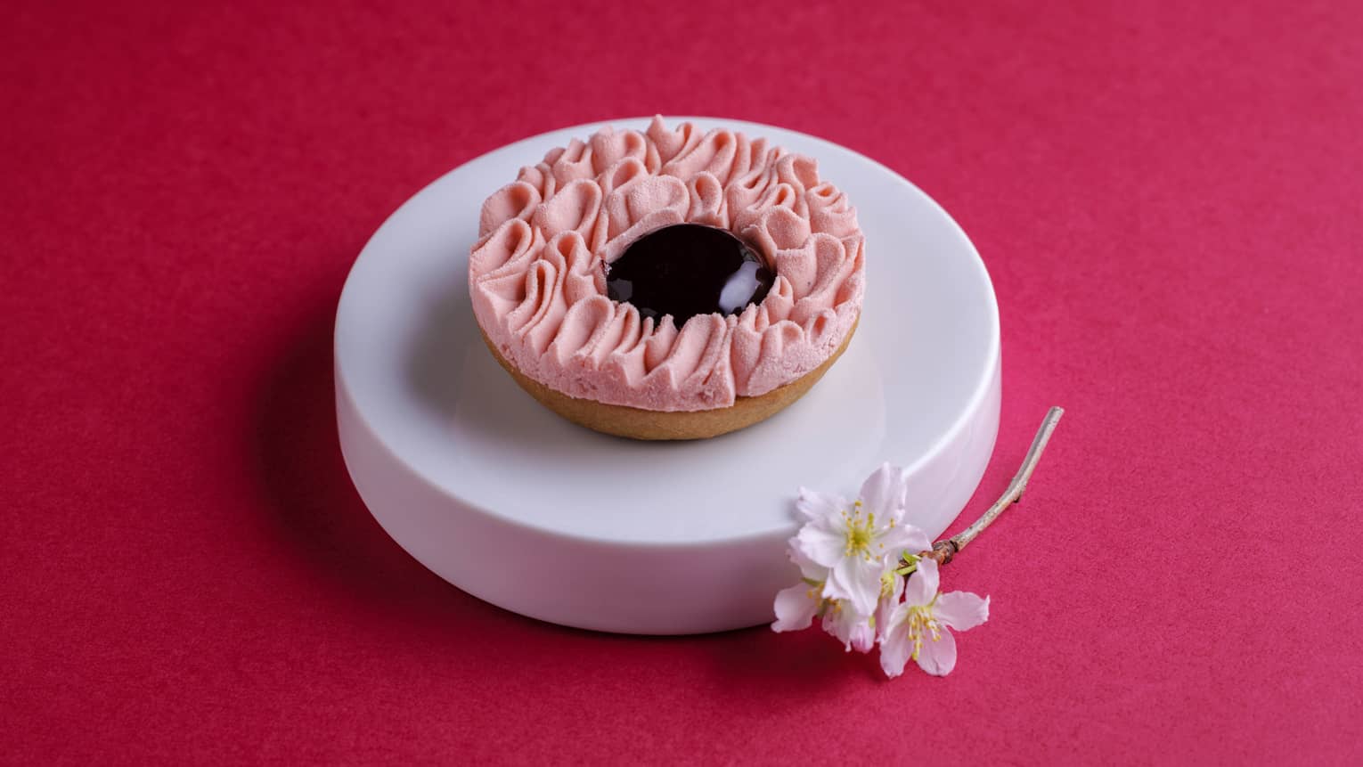 桜とフリュイノワールのタルトルビー色に輝くブラックベリーとカシスのコンポートを、美しい曲線を描く桜のシャンティで優しく包み込んでいます。桜のほのかな香りが漂う滑らかなシャンティと、ベリーの瑞々しい甘みが溶け合って繊細な味わいが広がります。そこに歯ごたえのあるタルトを合わせ異なることで複数の食感が重なり合う、まるでコースの最後を飾るデザートのような、奥行きある余韻を感じてください。