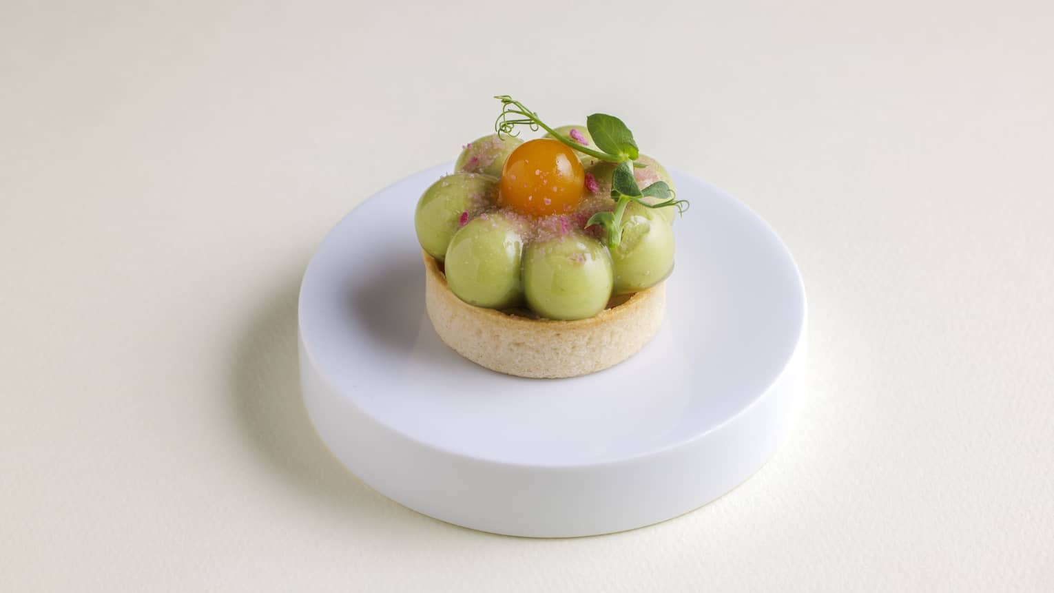 グリーンピースムースとパッションフルーツのタルトレット 桜クランチとベーコンクリームチーズグリーンピースのほのかな甘みと爽やかな春野菜の味わいに、パッションフルーツのトロピカルな酸味と香りが鮮やかに絡み合う、爽やかで意外性のある一品です。タルトレット生地が軽やかな食感を添え、春らしい軽快さが口いっぱいに広がります。