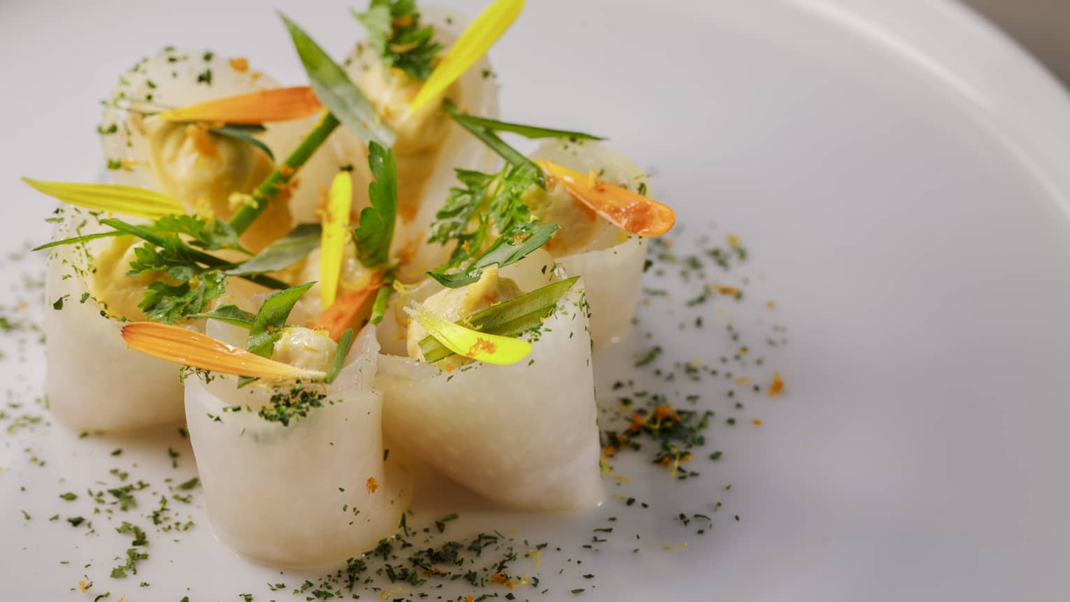 冬の訪れを告げる水仙をイメージした、仏と和が融合する一品を。北海道産ヒラメで淡いピンクとホワイトの美しい表情を表現し、フランス伝統のサバイヨンクリームと絶妙に合わせました。仕上げにカラマンダリンの皮を散らし、冬の清々しい香りを添えてお届けいたします。||期間:~2月末まで||時間:18:00 ~ 22:00||料金:28,000円