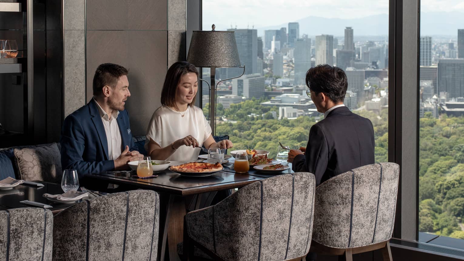 フォーシーズンズホテル東京大手町のザ ラウンジ THE LOUNGEは、大手町の高層階から東京のスカイラインと皇居の森を望むホテルラウンジです。スイーツや軽食とともに、時間ごとに変化する景色をお愉しみいただけます。マジックアワーには、サンセットから夜景への美しい移ろいとライブミュージックで、心に残るひとときをお届けします。