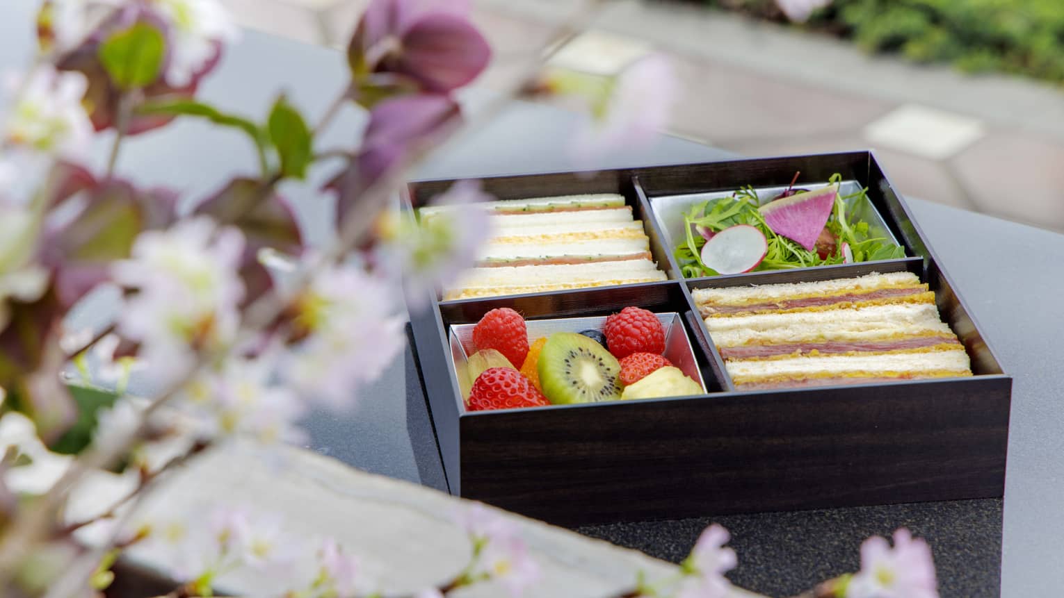 ビーフカツのサンドイッチを和風のランチボックスに詰めました。サラダや旬のフルーツも添えてお花見に、ちょうど良い、食べやすいサイズでお作りしております。||料金:6,000円 ※本サービスはご宿泊のお客様限定です。ご予約はお受け取りの3日前まで。