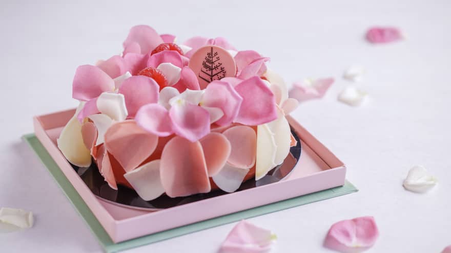 ガドーブーケミシュラン星付きダイニング「est」のミケーレ・アッバテマルコが手がける「ガトーブーケ」。艶やかな苺のグラサージュに、ルビーのように輝くフランボワーズと気品あふれるバラの花びらを添え、開けた瞬間から最後のひと口まで、花束のように輝きを放つ、特別な日にふさわしい贅沢でエレガントなブーケケーキです。||料金:13センチ6,500円