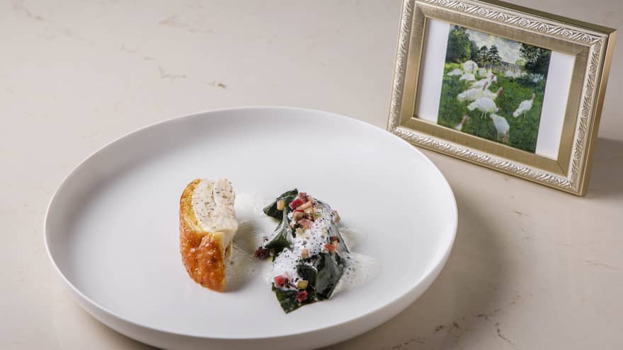 est(エスト):地鶏 スイスチャード ヘーゼルナッツ (オルセー印象派展 コラボレーションメニュー)柔らかな陽射しの降りそそぐフランスの田園。緑あふれる広い庭園の中を七面鳥たちが羽を揺らしながら穏やかに餌をついばんでいる、この鮮やかな情景を、映し取った一皿です。ほどよい歯ごたえにヘーゼルナッツの香ばしい余韻が広がるローストと、挽き肉にフランスで親しまれているスイスチャードをやさしくまとわせ、鶏出汁で仕立てた真っ白なソースを添えたもう一品。その白と緑の鮮やかな対比の中に、活き活きとした七面鳥の姿を重ね合わせています。写真:クロード・モネ《七面鳥》||期間:11月1日(土)~11月30日(日)||時間:12:00 ~ 15:00||料金:14,000円(5品)~