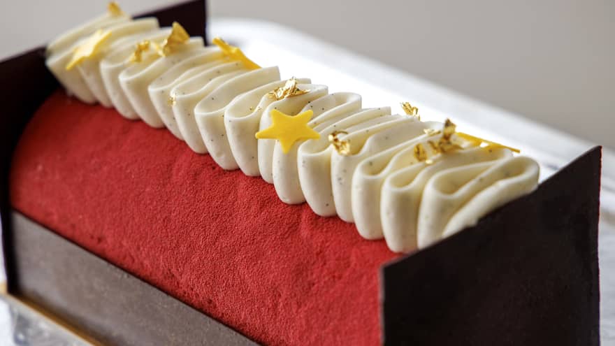 ブッシュ ド ノエルご家族や大人数の華やぐお集まりの場の主役に、クリスマスカラーに身を包んだブッシュ ド ノエルで祝祭を。艶やかなベルベット調のこのクリスマスケーキは、真っ赤なチョコレートと繊細なシャンティクリームで華やかに仕上げました。ヘーゼルナッツのスポンジをベースに、ジャンドゥーヤクランチ、クレムー、ムースを丁寧に重ね合わせており、香ばしいナッツの深みとリッチな口当たりが、クリスマスの特別なひとときをより一層華やかに彩ります。||予約期間:2025年10月1日(水)~||お渡し期間:2025年12月15日(月)~25日(木)||料金:7,500円