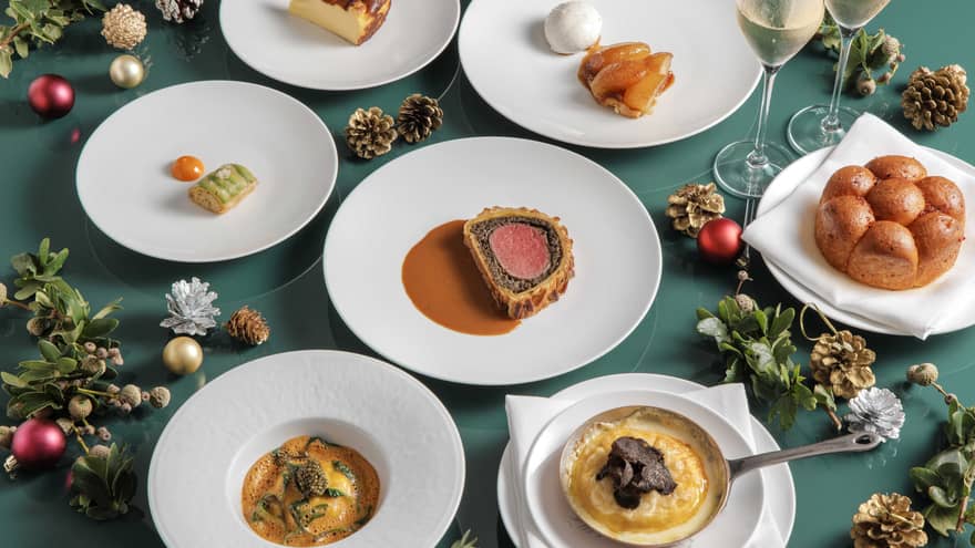 MAISON MARUNOUCHI(メゾン マルノウチ):フェスティブ ディナーシェフラウル・サヴィによる、日本、フランス、イタリアから厳選された旬の食材をふんだんに使用したコース料理をご用意しております。コースの主役は熟成 12 ヶ月のコンテと冬トリュフを用いた「スフレ シュイセス」、オシェトラキャビアを添えた「ロブスターラヴィオリ ビスク グリーンピース」、そして 14 日間熟成させた北海道産牛フィレ肉を使用した「牛フィレ肉のウェリントン ペッパーコーンソース」など。温かなパリのビストロを思わせる空間で華やかでロマンティックなひとときを演出します。||期間:12月24日(水)・12月25日(木)・12月31日(水)||時間:17:00~23:00||料金:35,000円