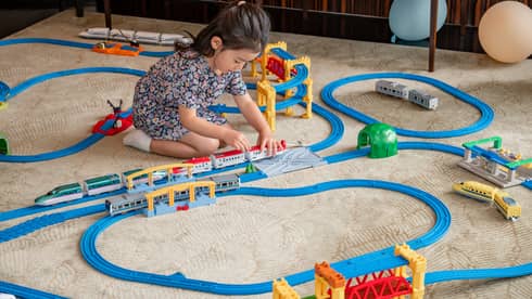 お部屋にご用意したプラレールで遊びながら、電車が目の前で行き交う迫力あるトレインビューを楽しめる、ご家族向けのスペシャルプランです。