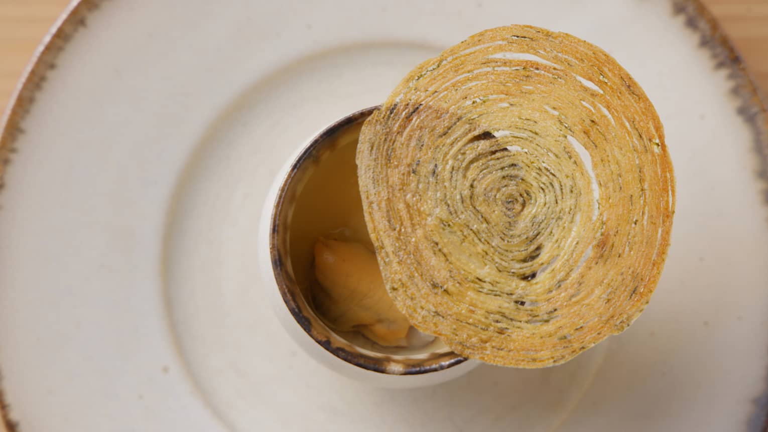 Dashi Royale사케 포치드 머셀, 크리스피 포테이토 해초 아를레트