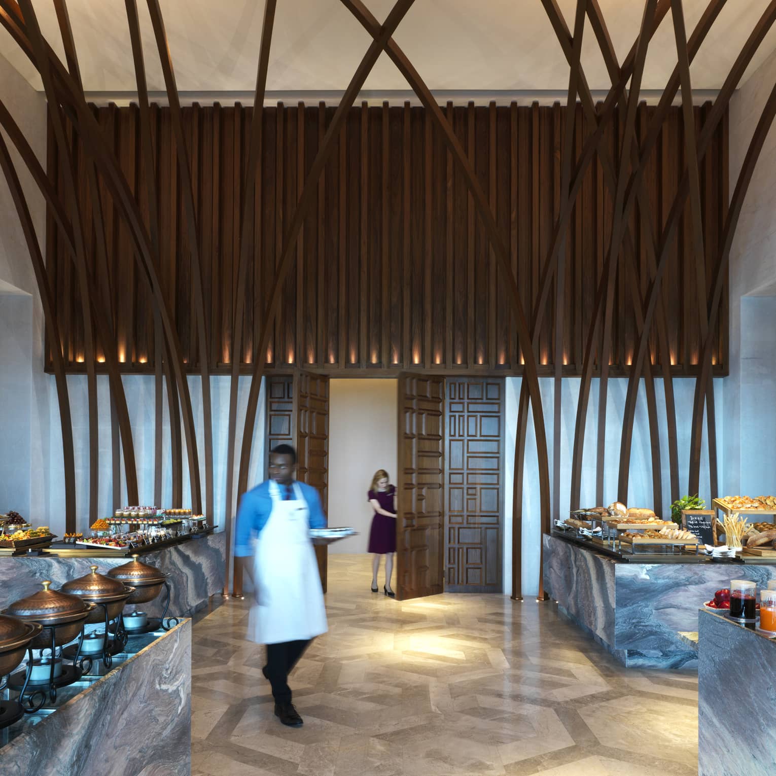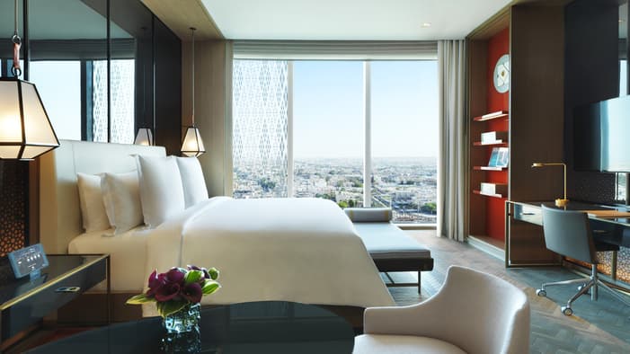 Elevated by soaring 3.5-meter (11.5-foot) ceilings, adorned with curved sofas and graced by herringbone oak floors, our Park Rooms exude an aura of suite-like elegance with elements that harmonize with the panoramic Al Shaheed Park view. The rooms’ atmosphere is further enriched by the burnt-orange lacquer panels, creating a cosy and modern feel that complements the natural beauty outside.