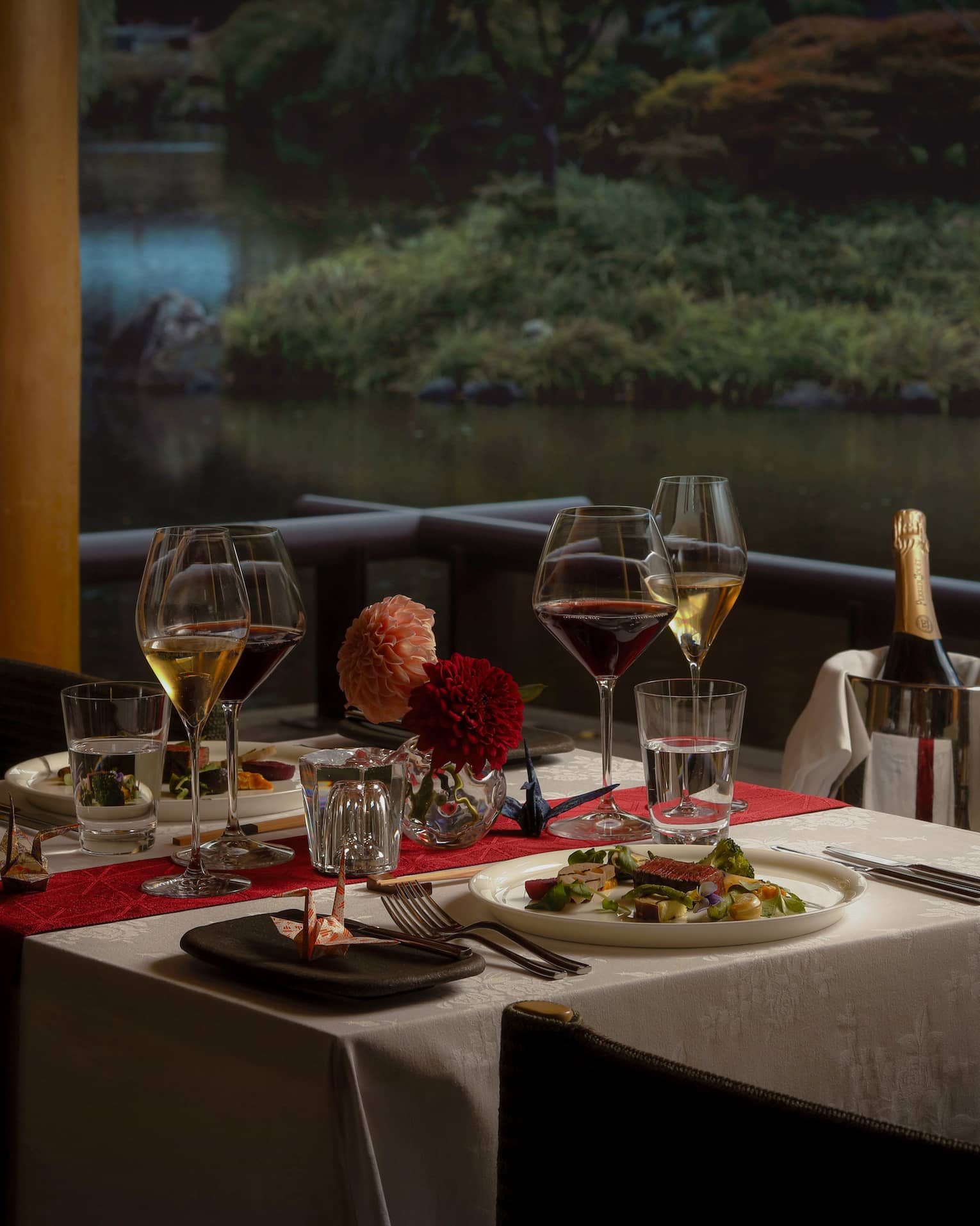 Step into Shakusui-en, our 800-year-old pond garden, where tranquillity meets romance. Enjoy our menu course that celebrates Kyoto's fine seasonal ingredients – from delicate canapés and fresh seafood to charcoal-grilled dishes and Wagyu beef. Each course harmoniously blends authenticity and innovation for an unforgettable dining experience.