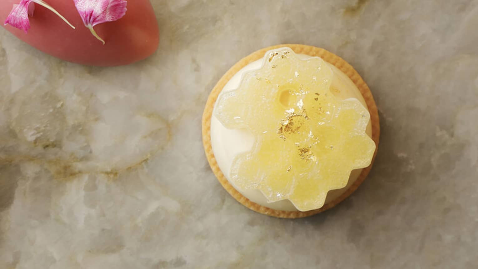 Delicately wrapped in light sponge cake, layers of orange bavarois and apricot mousse are finished with kumquat and lemon jelly. A signature creation by Pastry Chef Nanbu, this elegant dessert is topped with a honeycomb-shaped cookie, offering bright citrus notes and a light, refreshing finish.