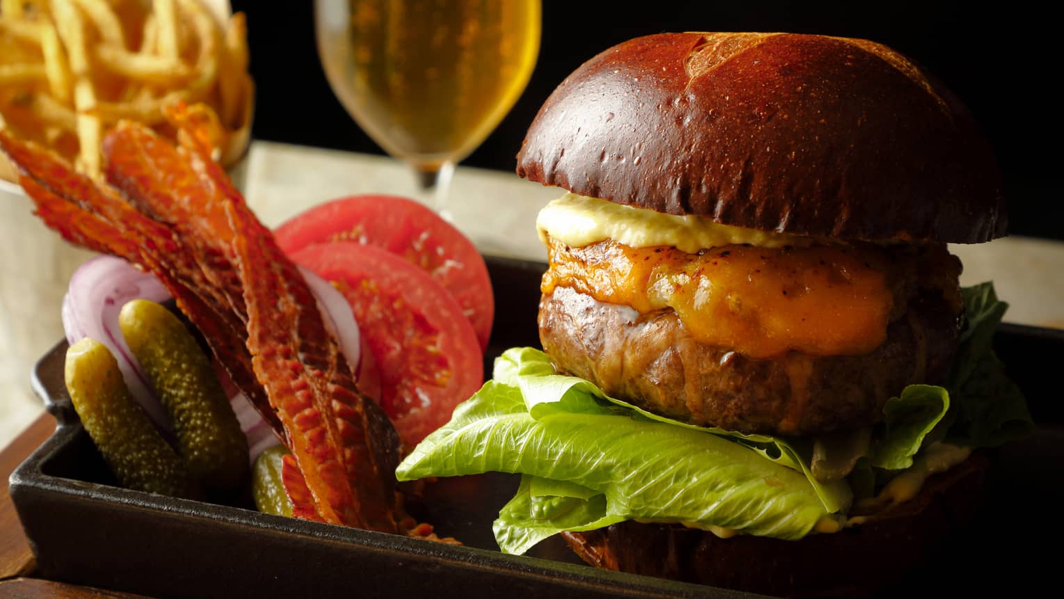 EMBA SIGNATURE WAGYU BURGER (7 oz.)Premium Aged Cheddar Cheese, Yamazaki Whisky Glaze, Homemade Onion Jam, Wasabi Mayonnaise