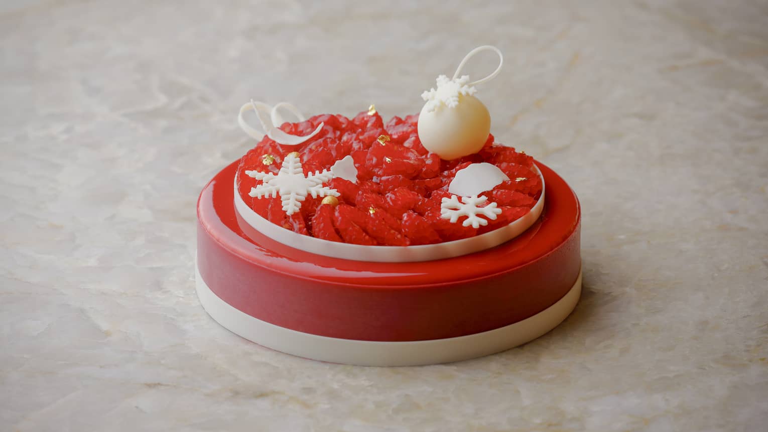 Dressed in red, this elegant cake features six layers, including lemon sable and fresh raspberries, all infused with the fragrance of edible Sahime roses from Shimane prefecture. 15 centimetres: JPY 7,500; 12 centimetres: JPY 5,500. Orders accepted through December 15. Pickup available December 20 to 25.