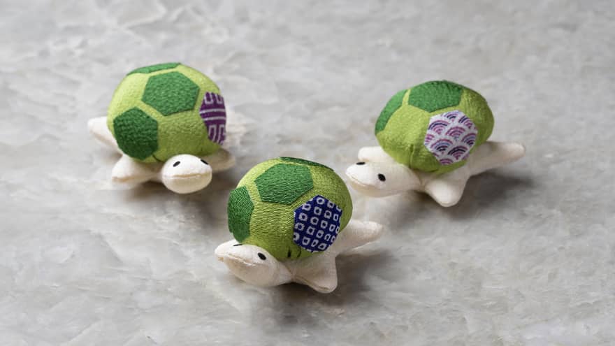 Inspired by the turtles that swim in our 800-year-old pond garden, each toy is handcrafted from vintage Kyoto kimono fabrics, including yuzen-dyed silk, tango chirimen and shibori. Every piece is one-of-a-kind, carrying the beauty of tradition and the serenity of the city. JPY 1,870 each.