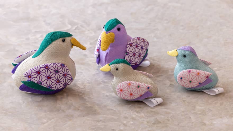 Crafted from Kyoto chirimen silk, this palm-sized ornament is inspired by the spot-billed duck at Shakusui-en, our 800-year-old pond garden. It makes an elegant addition to your home décor or a thoughtful gift for someone special. Available in purple, beige and blue. Large: JPY 2,970; small: JPY 1,870.