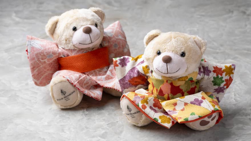 Our Four Seasons teddy bear is dressed in a handmade kimono of vibrant Yuzen, Tango chirimen and Kyoto shibori fabrics, with a chirimen obi. Embroidered with our hotel logo on its right foot, the bear is the perfect memento of your trip, capturing quintessential Japanese aesthetics. 15 centimetres: JPY 14,080.