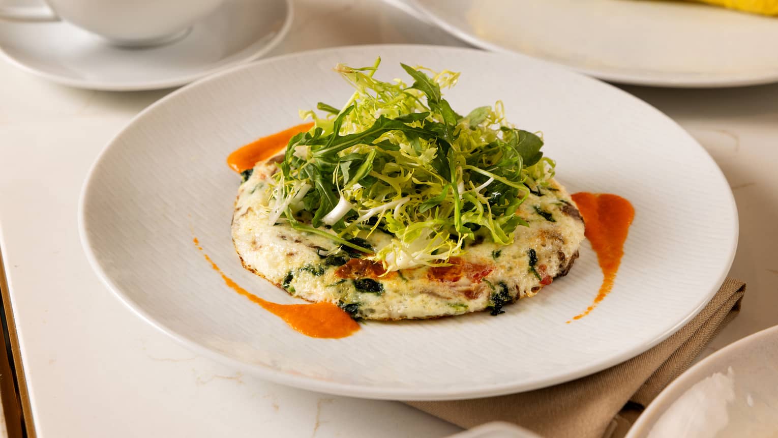 FARMER’S EGG WHITE FRITTATARed Peppers, Asparagus, Spinach, Tomato, Mushrooms, Laura Chenel Goat Cheese, Vine-Ripened Tomato Coulis, Baby Arugula